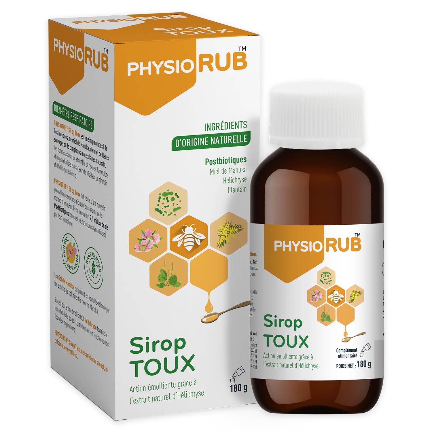 Sirop Toux PhysioRUB(tm) - Postbiotiques & Miel de Manuka - Maux de gorge - Immortelle & Plantain - Fabriqu en France - 180g