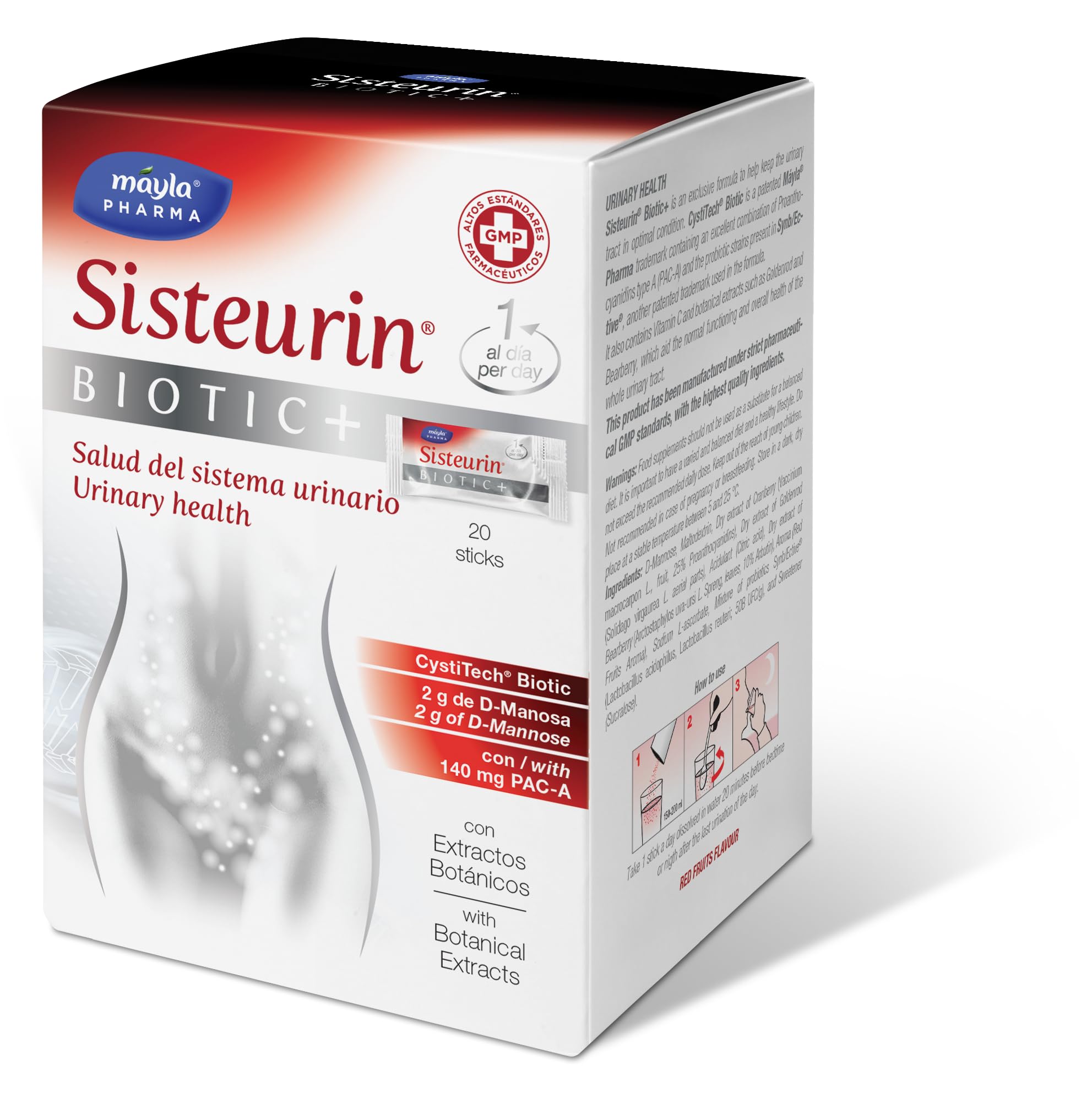 Siteurin Biotic is an exclusive formula designed with a carefully studied combination of high-quality ingredients specially selected to help maintain optimal urinary tract health. It contains CystiTech Biotic, a complex specifically formulated to offer a perfect combination of PAC-A and probiotics. It also features a high concentration of D. Manosa, which helps protect the walls of the urethra and bladder from bacterial adhesion, as well as Gayuba and Goldenrod (Solidago Virgaurea), which in turn contribute to lower urinary tract health. CystiTech Biotic was formulated by our iD department and contains a high concentration of type A proanthocyanidins that act on bacterial adhesion in the urinary system. This creates a synergy with the bacteria present in the urinary system and with the various probiotic blends in SynBalance Femme, which contribute to microbiota modulation. This product effectively protects the vaginal flora against bacteria. Furthermore, the formula also includes 2 grams of D-Manosa, a component of the epithelial cells of the urinary tract, and standardized red bilberry extract with a total of 140 mg of PAC-A, the only compound that truly protects against bacterial adhesion in the urinary tract. It also contains vitamin C and botanical extracts such as Vera d'Or and Gasole, which contribute to the normal formation and overall health of the urinary tract. Warnings: Food supplements should not be used as a substitute for a varied and balanced diet. Do not exceed the expressly recommended daily dose. Keep out of reach of young children. Store in a dark, dry place at a stable temperature between 5 and 25 C. Ingredients: D-Manosa, goldenrod dry extract (Solidago virgaurea L., 10:1 ratio), maltodextrin, red bilberry dry extract (Vaccinum macrocarpon L., 30 proanthocyanidins), acidifier (citric acid), wart dry extract (Arctostaphylos raisin-ursi (L.) Spreng., 10 arButin), flavoring, sodium L-ascorbate, Excoyan bilberry dry extract (Vaccinum macrocarpon L., 50 proanthocyanidins), Synbalance lactic acid bacteria blend (Lactobacillus reuteri), and sweetener (sucralose). INGREDIENTS D-Manosa, golden stem dry extract (solidago virgaurea L., ratio 10:1), maltodextrin, red bilberry dry extract (vaccinum macrocarpon L., 30 proanthocyanidins), acidifier (citric acid), diesel dry extract (arctostaphylos raisin-ursi (L.) Spreng, 10 arButin), flavoring, sodium L-ascorbate, Excoyan red bilberry dry extract (vaccinum macrocarpon L., 50 proanthocyanidins), Synbalance lactic acid bacteria blend (Lactobacillus reuteri) and sweetener (sucralose).Máyla Pharma recommends that you complement this treatment with SISTEURIN Intimate Hygiene Gel. Warning: Food supplements should not be used as a substitute for a balanced diet. It is important to have a varied and balanced diet and a healthy lifestyle. Do not exceed the expressly recommended daily dose. Not recommended during pregnancy or breastfeeding. Keep out of reach of young children, store in a dark, dry place at a stable temperature between 5 and 25 C. Directions for use: Take 1 stick per day, preferably in the evening, shortly before bedtime. Can be used with antibiotics space out the doses. Active ingredients: D-Mannose 2000 mg CystiTech Biotic: -Ext. American Red Cranberry - Probiotic Blend (Synb Ective) (PAC-A) - American red cranberry, dried goldenrod, dried bearberry, vitamin C. It works on three levels: intestinal (the source of the bacteria that usually cause urinary tract infections), vaginal (thanks to the probiotics, which balance the vaginal flora), and urinary (prevents bacterial growth in the bladder). It includes a special combination of probiotics, supporting or reducing the need for antibiotic treatment and providing a complete and effective solution.Sisteurin Biotic 20 Sticks 2000 mg de D-Mannose CystiTech Biotic PAC-A approche triple unique agissant au niveau intestinal, vaginal et urinaire 1 prise par jour.DESCRIPTION DU PRODUIT DESCRIPTION DU PRODUIT Siteurin Biotic est une formule exclusive conçue sous une combinaison étudiée d'ingrédients de haute qualité qui ont été spécialement sélectionnés pour aider à maintenir les voies urinaires en parfait état. D'une part, CystiTech Biotic, un complexe spécialement formulé pour offrir une combinaison parfaite entre PAC-A et probiotiques. D'autre part, une grande concentration de D.Manosa qui aide à protéger les parois de l'urètre et de la vessie de l'adhésion des baceries, de la Gayuba et de la baguette d'or (Solidago Virgaurea) qui, à leur tour, contribuent à la santé des voies urinaires basses. CystiTech Boitic, a été formulé par notre département iD et contient une forte concentration de proanthocyandines de type à qui agissent sur l'adhésion des bactéries dans le système urinaire et crée une synergie avec les bactéries dans le système urinaire et crée une synergie avec les différentes coupes probiotiques présentes dans SynBalance Femme, qui contribuent à la modulation du microbiote. vaginfavorfavorfavorfavorfavorde manière efficace la protection de la flore vaginale contre toute bactérie. En outre, il est également inclus dans la formule 2 grammes de D-Manosa, qui fait partie des cellules épithéliales des voies urinaires, et l'extrait standardisé de myrtille rouge avec un total de 140 mg de PAC-A, les seules qui agissent de manière réelle sur la protection de l'adhérence des bactéries dans les voies urinaires. Contient également de la vitamine C et des extraits botaniques tels que la Vera d'or et la gazole qui contribue à la formation normale et à la santé générale de tous les voies urinaires. Avertissements : les compléments alimentaires ne doivent pas être utilisés comme substituts à un régime varié et équilibré. Ne pas dépasser la dose journalière expressément recommandée. Tenir hors de portée des plus jeunes enfants. Conserver dans un endroit sombre et sec, à une température stable entre 5 et 25 C. Ingrédien