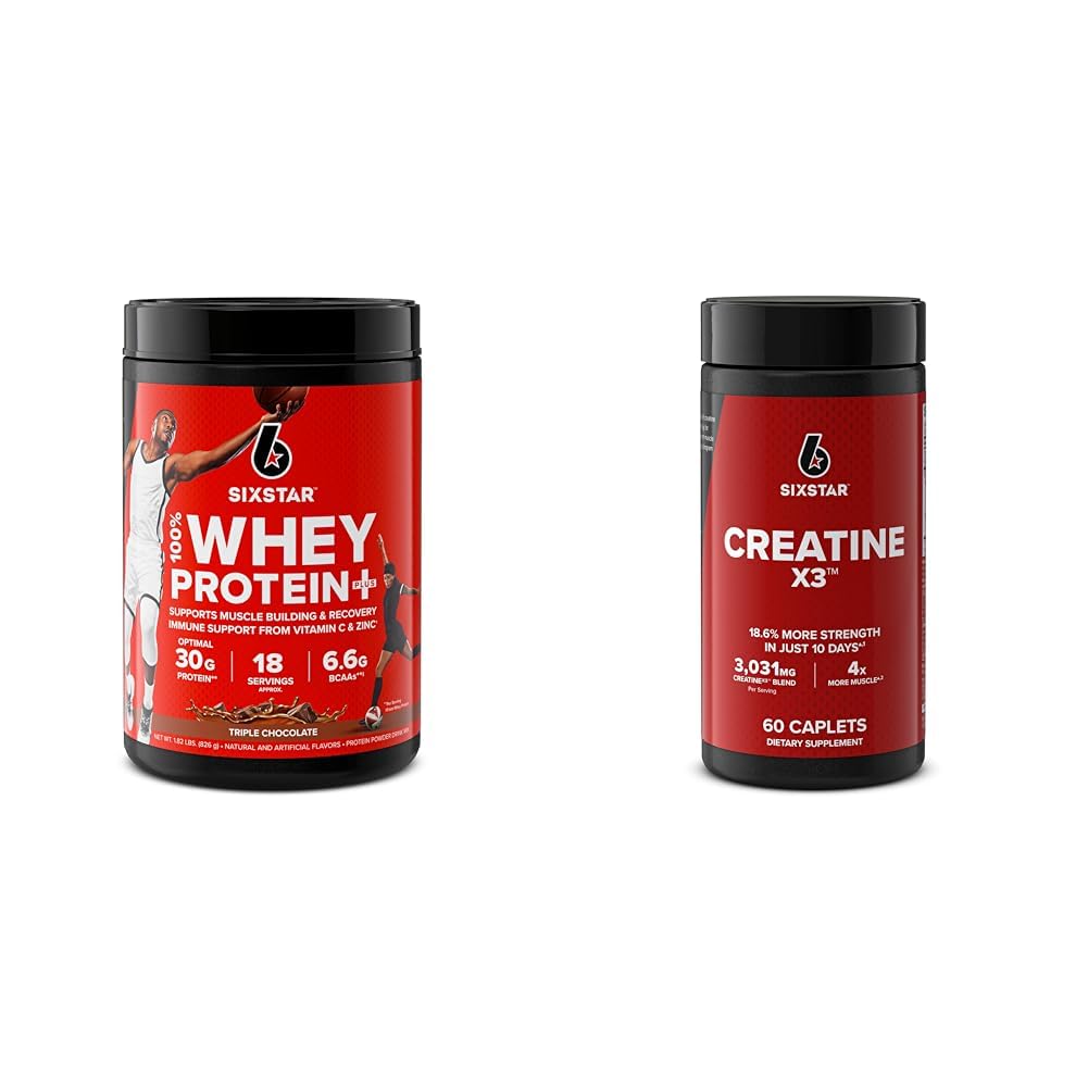 The Six Star Elite Series 100 Whey Protein Plus Triple Chocolate and Six Star Creatine Pills bundle provides a powerful combination of protein and creatine to support muscle growth and post-workout recovery. The 1.8 lb tub of Six Star 100 Whey Protein delivers 30g of pure whey protein per scoop to fuel workouts and recovery. It features a complete amino acid profile with 13.4g BCAAs and is enhanced with an immune support matrix including Vitamin C and Zinc. Enjoy the rich triple chocolate flavor mixed with water or milk. Complement the protein with Six Star Creatine pills, providing an ultra-convenient 8,000mg creatine blend in capsule form. The creatine monohydrate and creatine HCl saturate your muscles, accelerating between-set recovery so you can train harder for longer. Creatine helps restore ATP energy stores in muscles by transforming ADP back into ATP. The fast-absorbing carbs rapidly replenish glycogen supplies. 2,500mg taurine and BCAAs further boost muscle performance and growth. Together this powerful bundle floods your muscles with premium protein and creatine to help you smash personal records and make rapid strength and size gains.