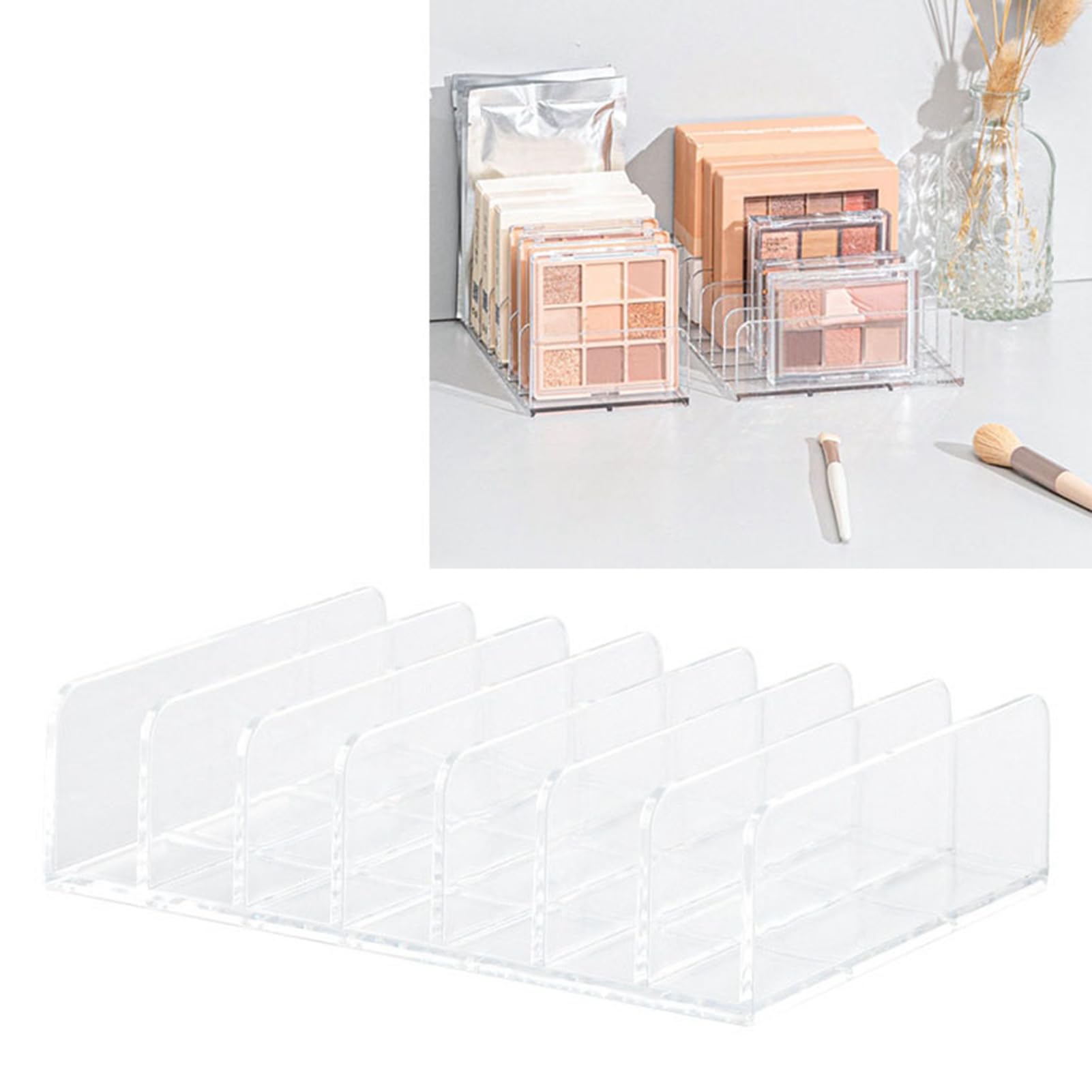 Built to Last: Made from durable, high-strength materials, this clear organizer is designed to withstand daily use while remaining easy to clean. Space-Saving: Designed to save space, this desktop organizer neatly arranges your cosmetics, creating a more efficient and organized makeup environment. Display and Style: Beyond functionality, this eyeshadow display contributes to the aesthetics of your vanity or makeup station, making your makeup palettes visually appealing and easily accessible. Versatile Design: This eyeshadow tray organizer features separate compartments, making it versatile enough to store various types of cosmetics and makeup tools. Convenient Visibility: With its clear design, this organizer allows for easy identification and selection of cosmetics, helping to streamline your makeup application process.
