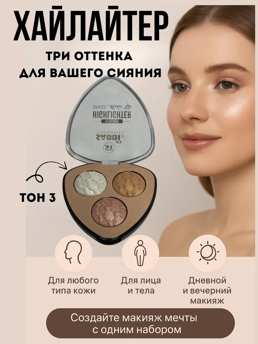 Introducing the universal highlighter palette in shade 3—the perfect solution for those who value convenience, quality, and the effect of professional makeup at home. This palette combines highlighter, blush, and contouring powder, transforming everyday makeup into art.