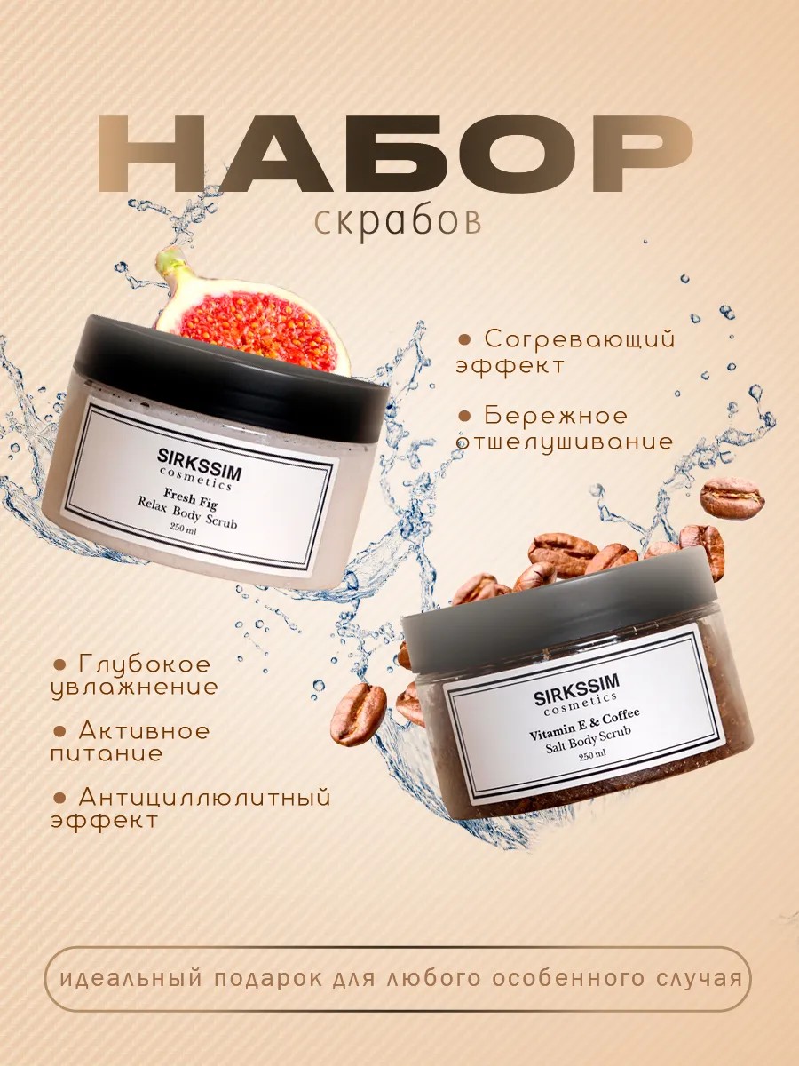 | Package Contents | Moisturizing and nourishing scrub-balm with fig aroma - 1 pc; Moisturizing and nourishing salt scrub with coffee - 1 pc; gift cardboard box - 1 pc; The box is additionally placed in a courier bag marked "carefully fragile" |