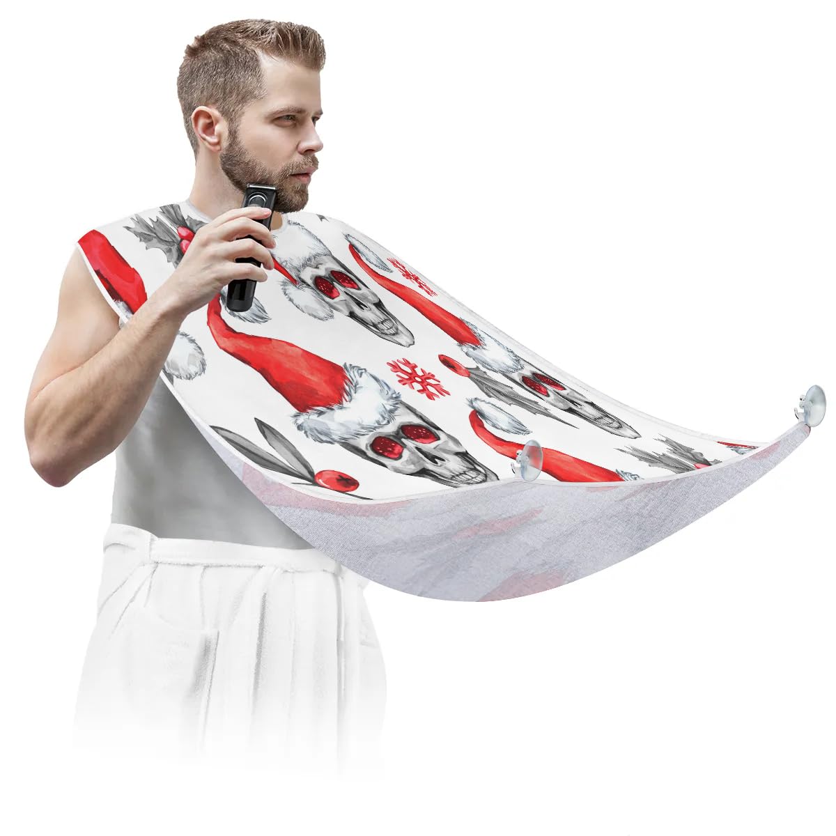 fiber fabric, ensuring exceptional quality. The fabric has a smooth and soft surface that is not sticky to hair, making it comfortable to wear during grooming sessions. It is also waterproof and anti-static, further enhancing its practicality. In addition, it is equipped with two high-quality suction hooks that provide powerful suction without leaving marks on mirrors or tiles. ?Convenient and Easy to Use?: Using our beard hair catcher is a breeze. Just fasten it around your neck using the adjustable strap and secure it to the mirror. Once in place, you can effortlessly proceed with your regular grooming routine. When you're done, simply remove the beard bib from the suction cups. Then brush the collected hair into the trash can for easy cleanup. ?Effortless Hair Cleanup?: Our Skeleton Christmas Hat beard bib is expertly designed to capture all loose beard hair, mustache, and sideburn trimmings, providing effortless cleanup and keeping your sink immaculately clean. This saves you valuable time that would otherwise be spent on tedious cleaning tasks. Not only does it serve a practical function, but it also adds a stylish touch to your daily grooming routine.