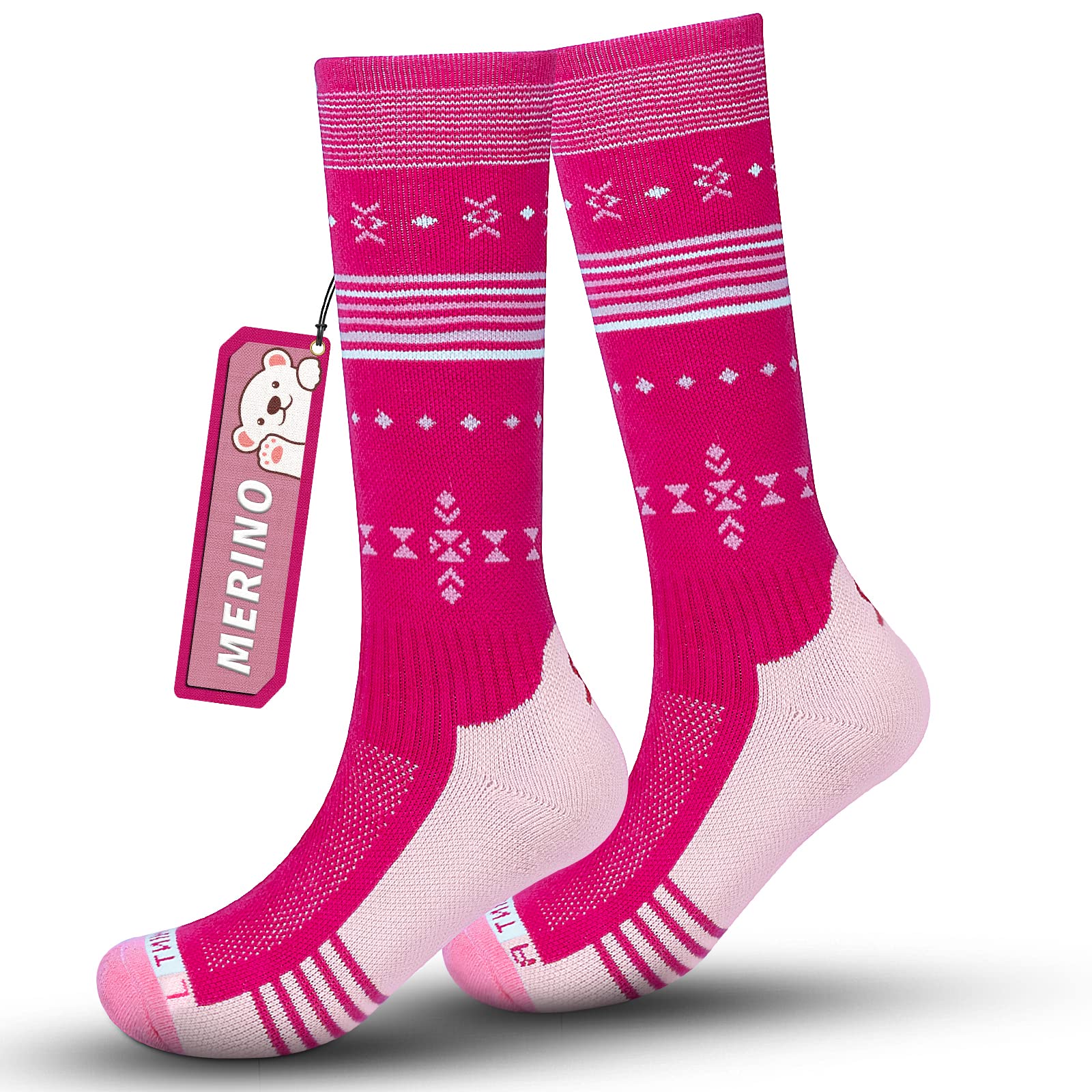 Ski socks children merino wool socks young girls otc stripes design thick padded knee high breathable warm compression children socks for winter outdoor sports 1 pair/2 pair 23-29 1 pair rose