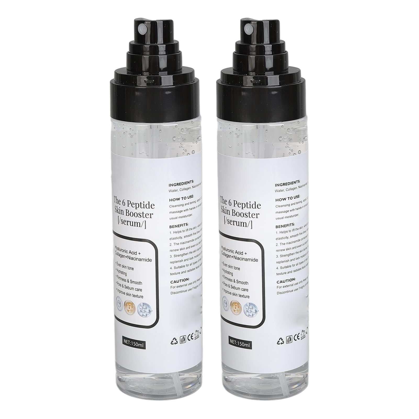 1. Hydrating and Moisturizing Serum: This Niacinamide serum deeply hydrates and replenishes the skin for a smoother and more plump appearance. 2. Brightening and Firming: The Collagen and Niacinamide in this serum help to brighten the skin tone and improve elasticity, resulting in a firmer and more youthful complexion. 3. Deep Hydration: This serum provides intense hydration, improving skin texture and reducing the appearance of fine lines and wrinkles. 4. Nourishing Ingredients: Enriched with Allantoin and Acetyl Hexapeptide-8, this serum delivers essential nutrients to the skin, promoting a healthy and radiant complexion. 5. Easy to Use: Simply apply a few drops of this serum to the face and gently pat it into the skin for fast absorption. Suitable for all skin types. Spec: Item Type: Skin Booster Serum Net Content: 150ml x 2 packing list: 2 x Skin Booster Serum SAFETY WARNING This product has no safety hazard to usersDeep Hydration: This serum provides intense hydration, improving skin texture and reducing the appearance of fine lines and wrinkles. Easy to Use: Simply apply a few drops of this serum to the face and gently pat it into the skin for fast absorption. Suitable for all skin types. Nourishing Ingredients: Enriched with Allantoin and Acetyl Hexapeptide-8, this serum delivers essential nutrients to the skin, promoting a healthy and radiant complexion. Hydrating and Moisturizing Serum: This Niacinamide serum deeply hydrates and replenishes the skin for a smoother and more plump appearance. Brightening and Firming: The Collagen and Niacinamide in this serum help to brighten the skin tone and improve elasticity, resulting in a firmer and more youthful complexion.