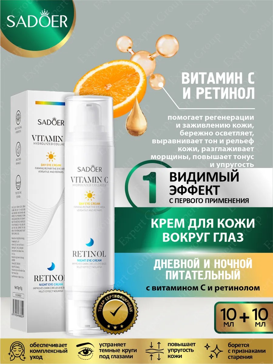| Комплектация | Дневной и ночной питательный крем для кожи вокруг глаз Sadoer с витамином С и ретинолом |