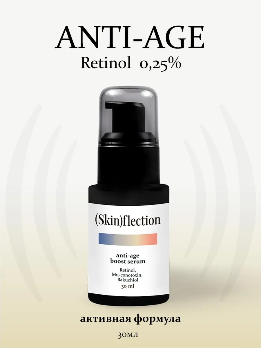 Skin Flection Anti-age Boost Serum — российская профессиональная уходовая косметика для кожи лица. Антивозрастная сыворотка с высокой концентрацией ретинола ваш помощник в борьбе с возрастными изменениями и проблемной кожей. Эффективно справляется с пигментацией, морщинами, потерей упругости, акне, постакне. Стимулирует синтез гиалуроновой кислоты и коллагена, замедляя старение кожи. Нормализует работу сальных желез, уменьшает воспаления и устраняет черные точки. Выравнивает тон и текстуру кожи, разглаживает мимические морщины, придавая ей естественное сияние и свежий вид. Skin Flection сыворотка подходит даже для чувствительной кожи. Благодаря бакучиолу и питательной базе формула действует мягко, не вызывая резкого раздражения.