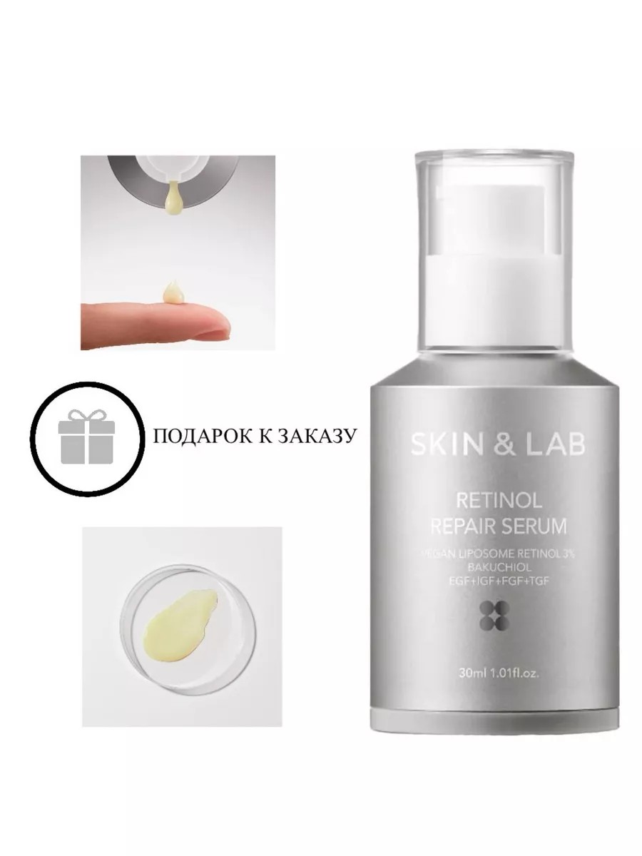 Антивозрастная сыворотка с 3% липосомального ретинола и пептидами SKIN&LAB Retinol Repair Serum уменьшает глубину морщин, повышает упругость и эластичность, разглаживает, выравнивает тон. Средство улучшает текстуру кожи, уменьшает видимость расширенных пор, сглаживает микрорельеф. Веганская формула с ретинолом, заключённым в липосомы, не вызывает раздражения, которое может возникнуть от обычного ретинола. Содержит 3% липосомального ретинола, бакучиол, 2 пептида и 7 эпидермальных факторов роста (EGF), а также хитозан, сквалан, пантенол и экстракт листьев дерева ним. Сыворотка также обогащена стабилизированной формой веганского ретинола и 9 типами пептидов. Эта легкая сыворотка нацелена на тонкие линии и морщины . Помогает укрепить кожу, не усугубляя высыпания. Усовершенствованная формула с активными веганскими ингредиентами: содержит веганский липосомный ретинол, бакучиол и пептиды для эффективного ухода за морщинами с меньшим раздражением. Липосомальный ретинол не только уменьшает признаки старения, но и улучшает текстуру вашей кожи. Бакучиол уменьшает появление тонких линий и помогает успокоить кожу, а пептиды помогают уплотнить кожу. Клинически доказано, что сыворотка может уменьшить мимические морщины, мелкие морщины вокруг глаз и глубокие носогубные складки. А также сыворотка улучшает плотность кожи и уменьшает высыпания.