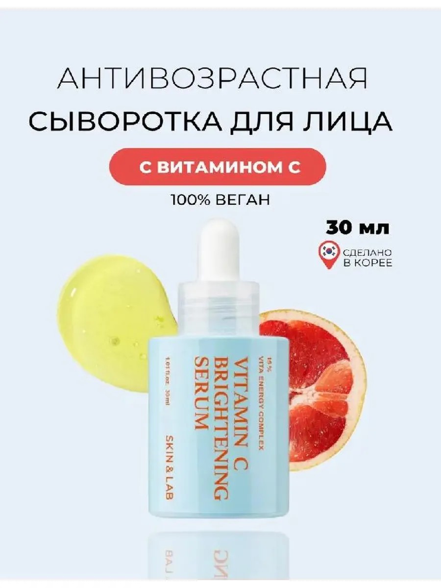 Сыворотка для лица с витамином С Skin Lab vitamin c brightening serum это продукт, который выравнивает тон лица, оказывает антивозрастной эффект, помогает бороться с морщинами и осветлять пигментацию. Она также увлажняет кожу и защищает её от обезвоживания, обладает лёгким лифтинг-эффектом, придаёт коже красивое здоровое сияние, слегка отбеливает её. Эта сыворотка произведена в Корее, известной своими высококачественными косметическими продуктами. В составе сыворотки присутствует стабильный витамин С 15%, гиалуроновая кислота и пептиды. Эти компоненты насыщают кожу влагой, в комплексе способствуют осветлению постакне, выравнивают рельеф кожи. Сыворотка идеально подойдёт в качестве базы для макияжа, а также для процедуры массажа лица. Она сочетается практически со всеми активными компонентами, её можно использовать 2 раза в день ежедневно. Для нанесения сыворотки удобно использовать пипетку, которая позволяет дозировать продукт. Сыворотка skin&lab поставляется в флаконе, который легко помещается в косметичку. В дневном уходе используйте её в паре с кремом с спф. Продукт можно использовать для всех типов кожи: для жирной, так как обладает лёгкой текстурой, так и для сухой, так как будет дарите ей мощное увлажнение. Регулярное использование этой сыворотки поможет сохранить молодость и красоту вашей кожи.