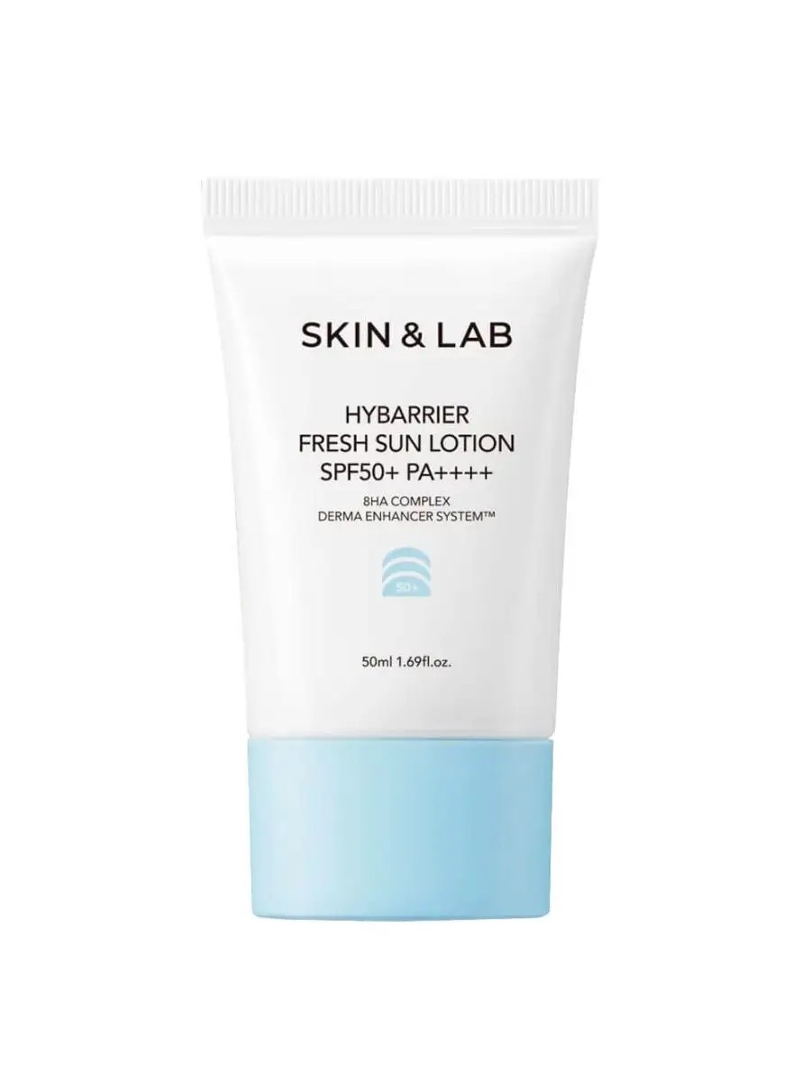 Солнцезащитный крем SKIN&LAB Hybarrier Fresh Sun Lotion SPF 50+ PA++++ не только надёжно защищает от покраснения, ожогов и других повреждений кожи, вызванных ультрафиолетом, но и интенсивно насыщает влагой, борется с сухостью и шелушением, смягчает.