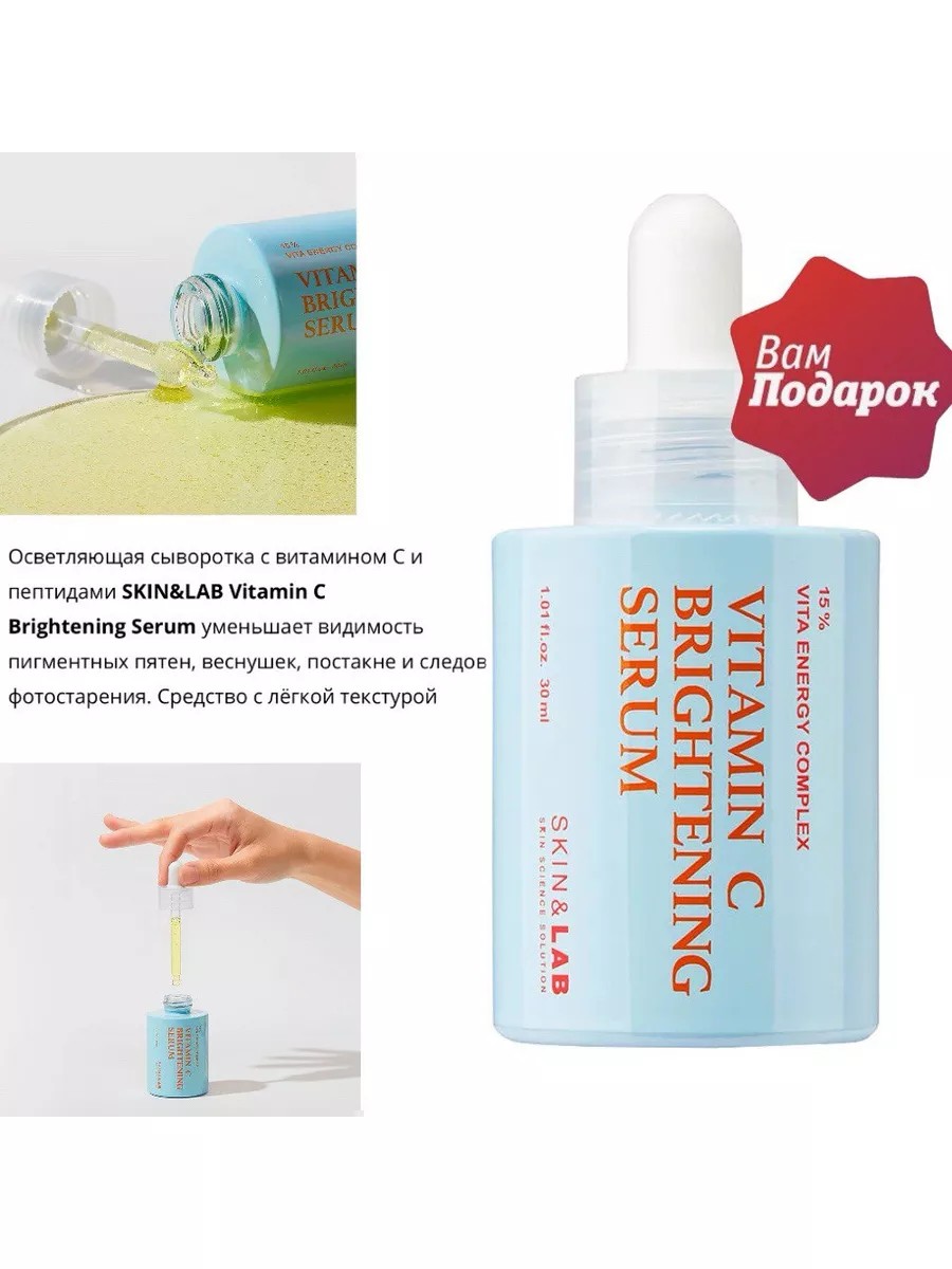 Осветляющая сыворотка с витамином C и пептидами SKIN&LAB Vitamin C Brightening Serum уменьшает видимость пигментных пятен, веснушек, постакне и следов фотостарения. С Vitamin C Brightening Serum 15% витамина С – прекрасная многофункциональная пептидная сыворотка на водной основе. Серум для лица в составе содержит смесь 15 витаминов. skin lab retinol одни из самых эффективных экстрактов, и комплекс увлажняющих компонентов, которые в совокупности с пептидами дают отличный anti-age эффект, способствующий омоложению возрастной кожи, предупреждает образование морщин. skin lab vitamin c для ухода за кожей лица поможет качественно отбелить пигментацию и следы постакне, а также подарить невероятное сияние здоровой и холеной кожи. Антивозрастная осветляющая сыворотка для лица, мощная и легкая, помогает выровнять тон, оказывает анти эйдж эффект. сыворотка с витамином с skin lab подходит для нормальной, чувствительной, жирной, комбинированной кожи. Идеальна также для проблемной кожи: борется с тусклостью, темными пятнами, неравномерной текстурой. Активные компоненты skin lab сыворотка: 1. Витамин C (3-O-этиласкорбиновая кислота): мощный антиоксидант, выравнивает видимые темные пигментные пятна и сужает поры.2. 15% комплекс Vita: осветляет тон. 3. Пептид Maxtrixyl 3000: повышает упругость и эластичность, способствует усилению выработки коллагеновых и эластиновых волокон, обеспечивая лифтинг - эффект и предупреждая образование морщин. 4. 5 типов гиалуроновой кислоты и пантенол (B5): мгновенно увлажняют сухую, успокаивают и восстанавливают покрасневшую и раздраженную кожу.Преимущества косметического средства: 1. Светящаяся кожа: сыворотка skin lab борется с гиперпигментацией, шрамами и пятнами от угревой сыпи, акне, прыщей, угрей. 2. Эссенция мгновенно увлажняет обезвоженную кожу, удерживает влагу и оставляет кожу свежей, снимая ощущение стянутости и сухости. 4. Молодая и здоровая: пузырьковые капсулы с витамином Е для борьбы с признаками старения.
