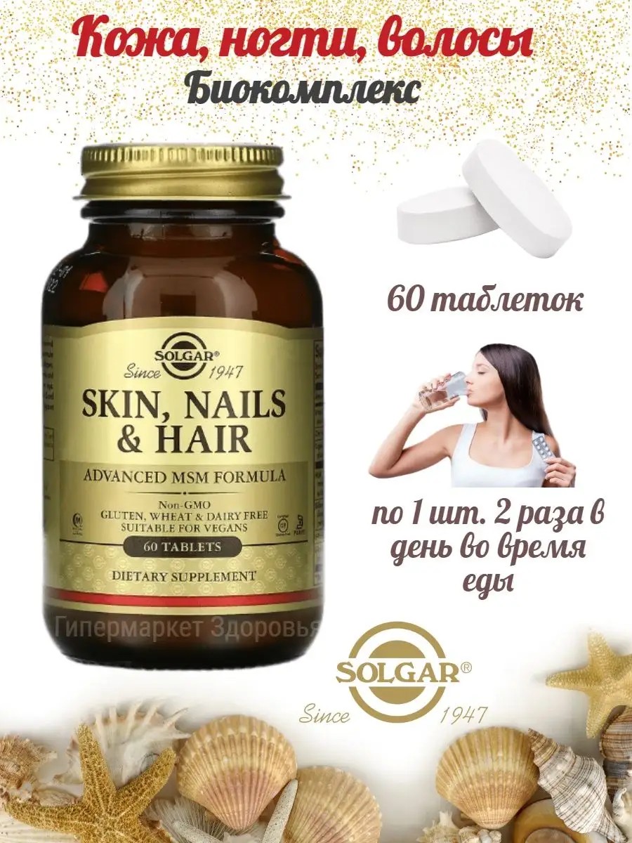 Solgar Skin, Nails, Hair contains methylsulfonylmethane, which stimulates the production of collagen and keratin. Keratin is the foundation of hair and nails; it strengthens them, adds elasticity and a healthy shine, restores their structure, and promotes growth. Collagen is the source of youthful skin. With adequate production of this substance, the skin acquires an even, healthy color, becomes more elastic, and its aging process is slowed. Using this product reduces the harmful effects of UV rays on the skin and normalizes the activity of the sebaceous glands. Instructions for use: It is recommended to take 1 tablet twice daily with meals. ***Not a medicine (dietary supplement). Before using this dietary supplement, consult a doctor. The photo of the dietary supplement may differ from the product you received, as the manufacturer reserves the right to change the appearance of the packaging.