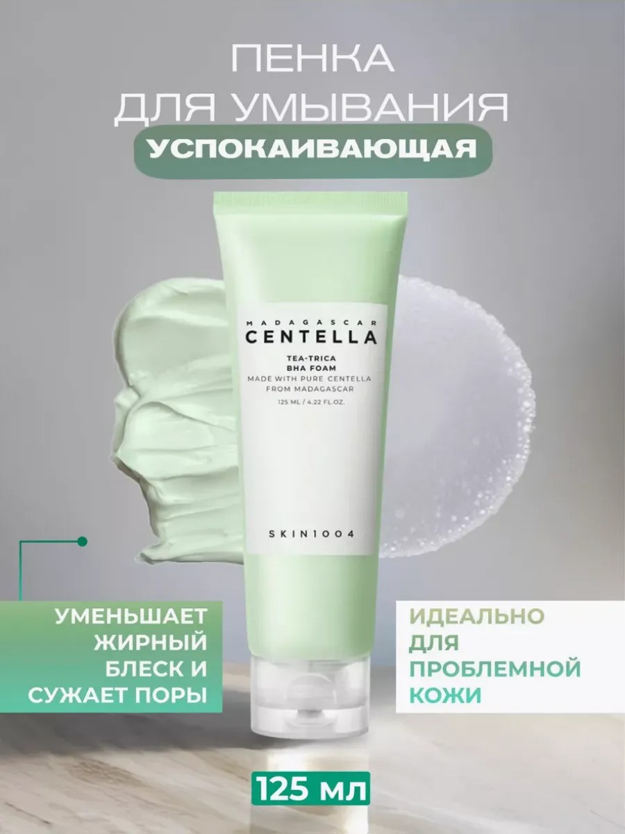 SKIN1004 Madagascar Centella Tea-Trica BHA Foam. Успокойте склонную к акне и раздраженную кожу с помощью уникальной формулы пенки, содержащей воду листьев чайного дерева, экстракт листьев королевской сосны, воду кипариса и экстракт центеллы азиатской.