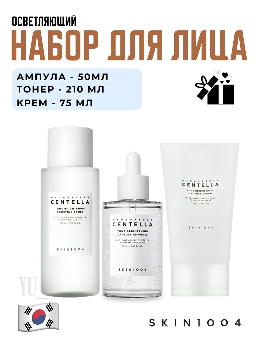 Тонер: Мягкий осветляющий тоник с центеллой SKIN1004 Madagascar Centella Tone Brightening Boosting Toner увлажняет, смягчает и бережно отшелушивает кожу, осветляя пигментацию и выравнивая тон. Уменьшает видимость следов от акне, устраняет тусклость и дарит здоровое сияние, не стягивая. Формула основана на 90% экстракте центеллы и содержит комплексы MadeWhite, SingGreen, а также ниацинамид, пантенол и витамин C.