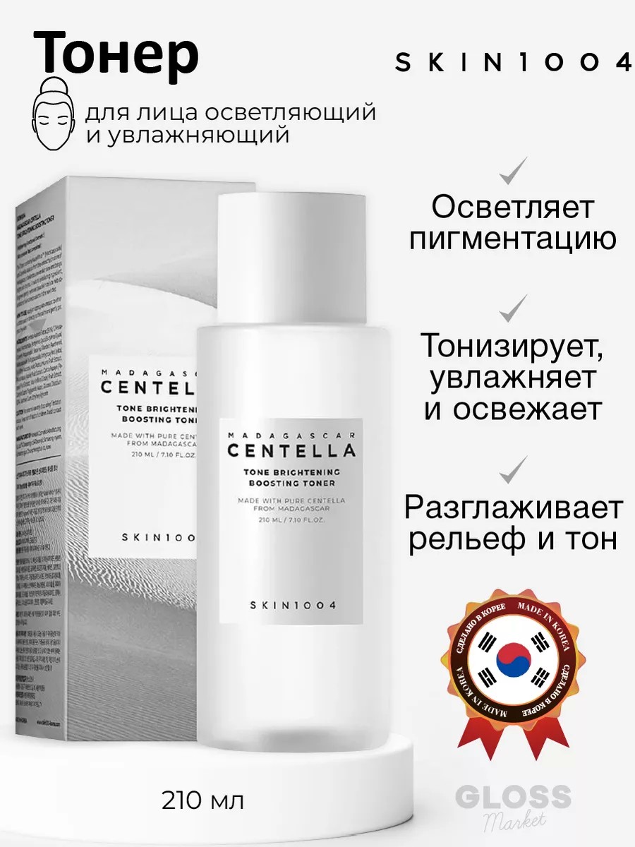 Тоник SKIN1004Madagascar Centella Tone Brightening Boosting Toner успокаивает и увлажняет,бережно отшелушивает кожу, осветляя пигментацию и выравнивая тон. Уменьшает видимость следов от акне, устраняет тусклость и дарит здоровое сияние, не стягивая. Продукт прекрасно подходит для борьбы с пигментными пятнами для чувствительной кожи. Удаляет омертвевшие частицы, поддерживает чистоту эпидермиса. Нейтральный уровень pH не нарушает естественный защитный слой. Водянистая текстура моментально впитывается и освежает. В 17 районах Мадагаскара, на уровне 700 м выше уровня моря, где среднегодовая температура равна 24~27°C, произрастает центелла азиатская— растение, экстракт которого используется в тонике. Высококачественное сырье повышает эффективность средства.90% экстракта центеллы, на котором основана формула, успокаивает и смягчает кожу, снимает раздражение и покраснение, укрепляет естественный защитный барьер и придаёт эластичность, а также защищает стенки сосудов, препятствуя появлению сосудистой звёздочки.