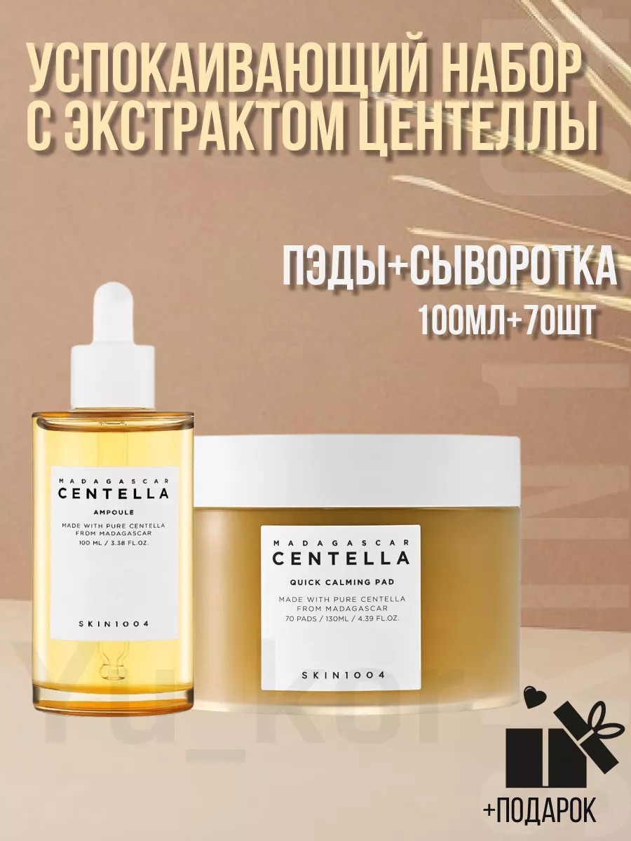 | Комплектация | Ампула из 100% экстракта центеллы азиатской SKIN1004 Madagascar Centella Ampoule; Успокаивающие пэды с центеллой SKIN1004 Madagascar Centella Quick Calming Pad |