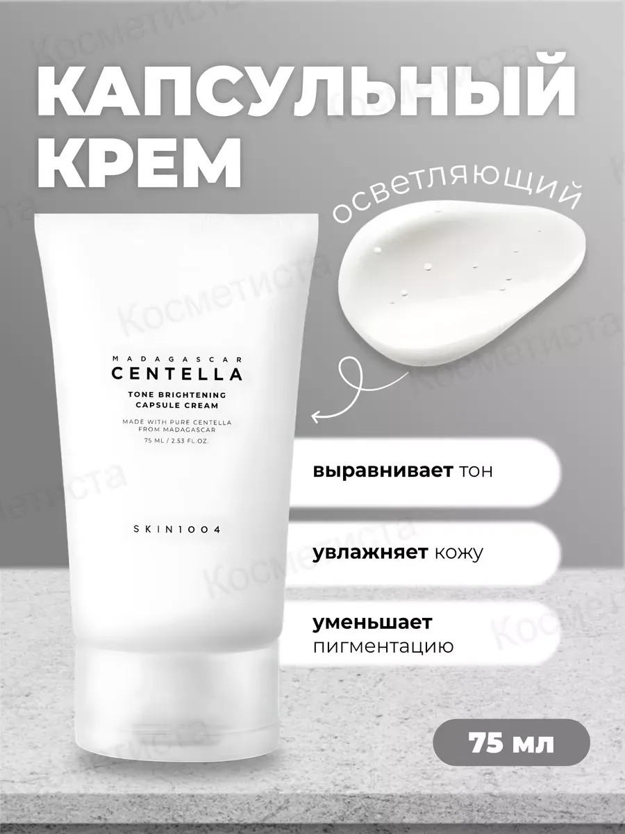 Капсульный осветляющий крем с центеллой SKIN1004 Madagascar Centella Tone Brightening Capsule Cream заметно выравнивает общий тон кожи, эффективно борется с тусклостью и улучшает цвет лица. Оказывает выраженное успокаивающее действие, стимулирует заживление воспаление и обладает антибактериальным свойством.