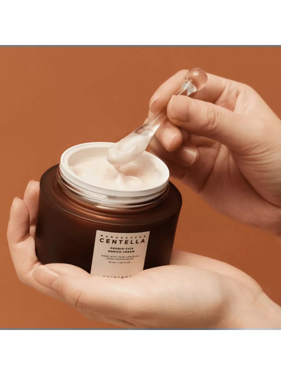 SKIN1004 Madagascar Centella Probio-Cica Enrich Cream, an intensive lamellar cream with probiotics, provides an overall strengthening effect, improves the skin's microbiota, and inhibits bacterial growth.