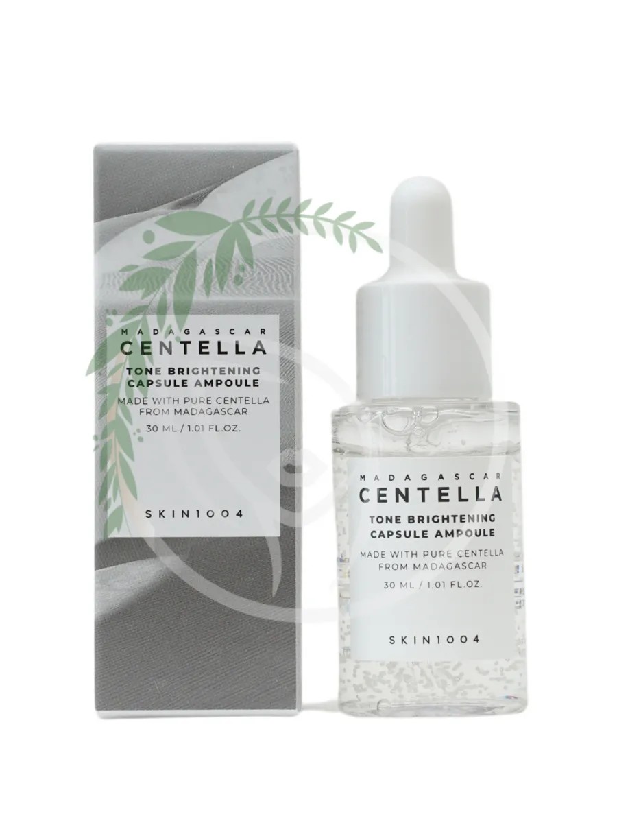 The SKIN1004 Madagascar Centella Tone Brightening Capsule Ampoule brightens the skin, helps combat age spots, and imparts a natural radiance. The ampoule contains a special patented ingredient, MadeWhite, a natural extract of Centella asiatica. This ingredient effectively inhibits melanin synthesis, thereby protecting the skin from age spots and brightening them. The component also has a soothing and moisturizing effect. The composition of the ampoule is enhanced with three brightening ingredients (niacinamide (4%), tranexamic acid (2%), 3-O-ethyl ascorbic acid). The ampoule is recommended for skin with an uneven tone, with breakouts and traces of post-acne. Directions for use: Apply a small amount of the product to cleansed and toned skin of the face, neck and décolleté with light massage movements.