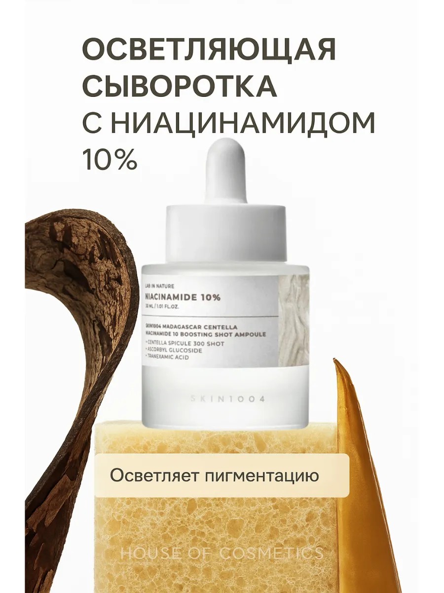 Ниацинамид 10% — мощный осветляющий компонент: борется с пигментацией и пост-акне, регулирует выработку себума, укрепляет кожный барьер и улучшает текстуру кожи.