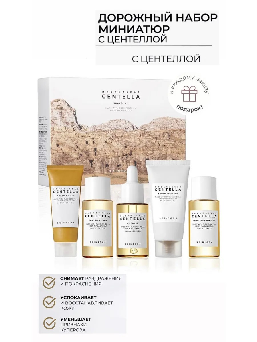 Дорожный набор миниатюр с центеллой SKIN1004 Madagascar Centella Travel Kit состоит из средств для очищения, тонизирования и увлажнения даже самой чувствительной кожи. В наборе хиты бренда — линейка с центеллой азиатской Madagascar Centella. Все продукты содержат экстракт центеллы, которая собрана в экологически чистых районах Мадагаскара — этот компонент снимает раздражение и покраснение, успокаивает и восстанавливает, уменьшает признаки купероза. В набор вошли:1. Madagascar Centella Light Cleansing Oil 30 мл легчайшее гидрофильное масло, сделанное на основе экстракта Центеллы с острова Мадагаскар, поможет мягко очистить макияж, при этом оказывая успокаивающее действе на кожу 2. Madagascar Centella Ampoule Foam 20 мл ампульная пенка для умывания на основе экстракт центеллы азиатской поможет эффективно, но мягко удалять загрязнения, обеспечивая успокаивающее действие3. Madagascar Centella Toning Toner 30 мл легкий увлажняющий тонер Madagascar Centella Toning Toner поможет успокоить раздражения кожи, а также окажется осветляющий и тонизирующий эффект. 4. Madagascar Centella Ampoule 30 мл ампула прекрасно подойдет для кожи склонной к повышенной реактивности, для ухода после пилингов и кислот и ежедневной профилактики акне и воспалений. 5. Madagascar Centella Cream 30 мл универсальный крем для всех типов кожи, который окажет эффективное успокаивающее действие, поможет справится с раздражениями, а также напитает и увлажнит кожу.