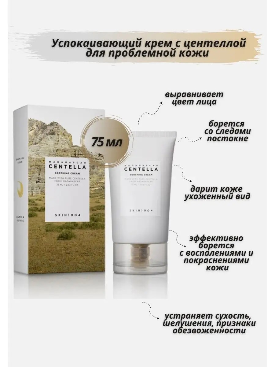 Успокаивающий крем с центеллой для проблемной кожи Skin1004 Madagascar Centella Soothing Cream - питает и увлажняет кожу, восстанавливает баланс, уменьшает покраснения и раздражение, связанное с высыпаниями, укрепляет защитный барьер кожи.Основной компонент крема — 72% экстракта центеллы азиатской, который применяется для лечения различных кожных проблем, он обладает антисептическим действием, улучшает выработку коллагена, обладает заживляющими свойствами, успокаивает проблемные области за короткое время, снижает выработку кожного сала. Крем подходит для кожи, подверженной воспалениям, а также применяется для лечения шрамов и пост акне.Керамид контролирует клетки кожи, удаляя мертвые клетки и заменяя их новыми клеточными частицами.Содержит 4 различных ботанических церамида, которые присутствуют в реальных кожных барьерах, и имеет слабокислый pH 6 для поддержания здорового состояния кожного барьера.Богат натуральными увлажняющими ингредиентами, мгновенно обеспечивает взрывное увлажнение.Основные свойства крема:- ярко выраженное успокаивающее и заживляющее действие;- эффективно борется с воспалениями и покраснениями кожи;-устраняет сухость, шелушения, признаки обезвоженности;- активизирует синтез коллагена;- укрепляет структуру кожного покрова и стенки капилляров;- восстанавливает ощущение комфорта;- дарит коже ухоженный вид- укрепляет защитный гидролипидный барьер эпидермиса;- устраняет воспаления, покраснения и высыпания кожного покрова;- выравнивает цвет лица;- борется со следами постакне;- способствует быстрому заживлению ран и микротрещин;- предотвращает преждевременное увядание эпидермиса;- запускает процессы обновления клеток.