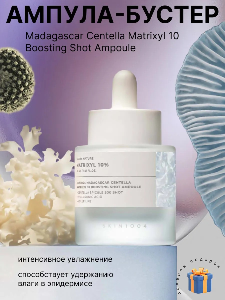 Ампульная сыворотка Skin1004 Madagascar Centella Matrixyl 10% Boosting Shot — это антивозрастной концентрат с 10% комплексом пептидов Matrixyl 3000 и 5% Volufiline, усиленный экстрактом центеллы с Мадагаскара. Формула содержит микроспикулы, которые усиливают проникновение активных веществ, стимулируя выработку коллагена, восстанавливая упругость и заметно разглаживая морщины. Лёгкая текстура глубоко увлажняет, делает кожу плотной и сияющей, улучшает овал лица и укрепляет защитный барьер кожи. Подходит для сухой, чувствительной и возрастной кожи. Без отдушек, парабенов и спирта. Подходит для ежедневного применения. Активные компоненты: Matrixyl 3000 (10%) — пептидный комплекс против морщин и потери упругости Volufiline (5%) — компонент для восстановления объема и тонуса кожи Экстракт центеллы азиатской — успокаивает и восстанавливает барьер Пантенол — снижает раздражение и укрепляет кожу Гиалуроновая кислота — глубоко увлажняет и повышает эластичность Результат: кожа становится более плотной, упругой и сияющей уже через 2–3 недели регулярного использования Способ применения: нанесите небольшое количество сыворотки на чистую кожу после тоника, распределите по лицу и завершите уход увлажняющим кремом. Используйте утром и вечером Оригинал.