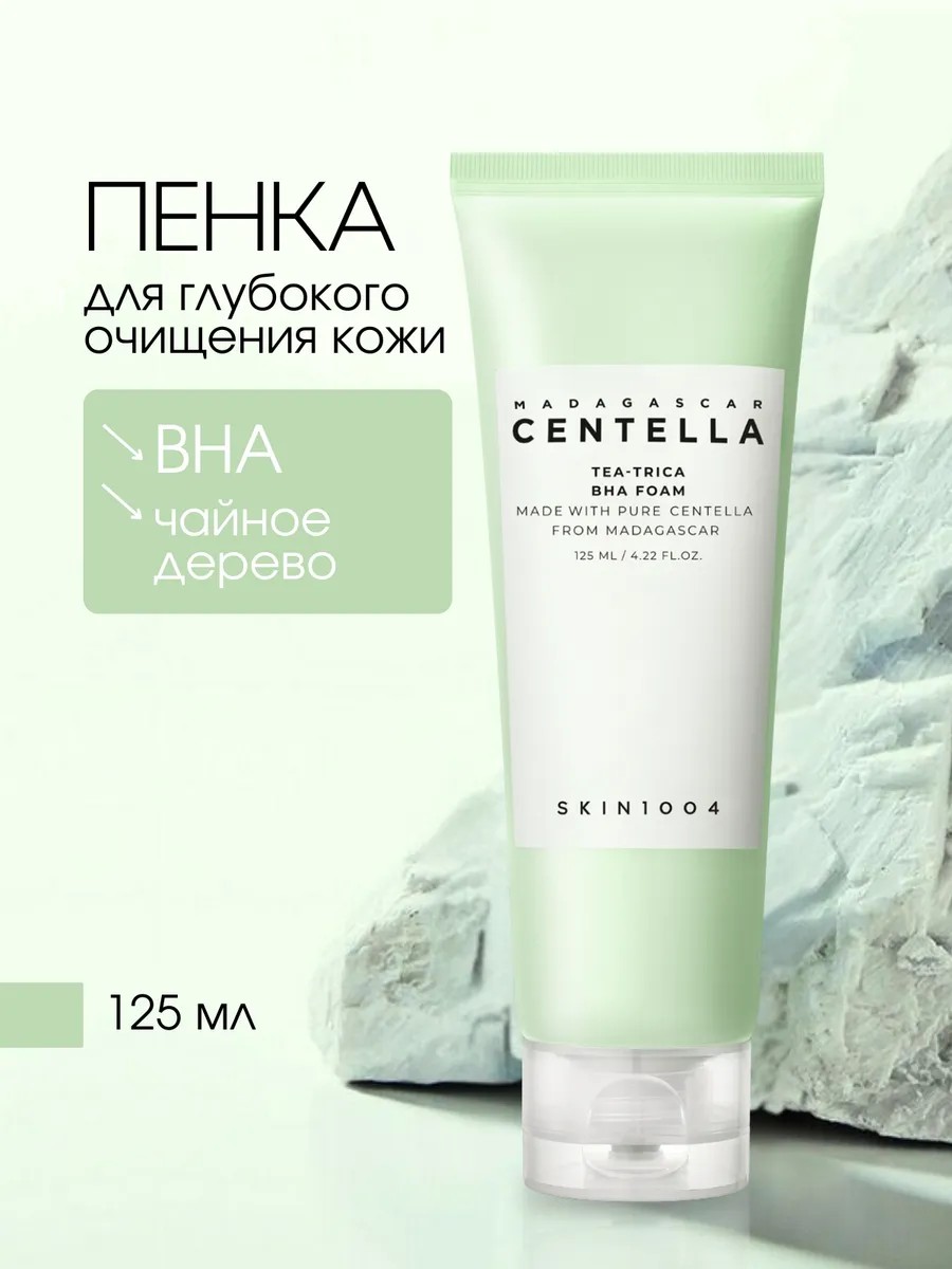 SKIN1004 Madagascar Centella Tea-Trica BHA Foam — идеальная пенка для умывания для жирной и склонной к акне кожи. Этот глубокочистящий гель сочетает в себе силу BHA (салициловой кислоты) и натуральных экстрактов, благодаря чему бережно удаляет излишки себума, отшелушивает ороговевшие клетки и очищает поры от загрязнений и комедонов.