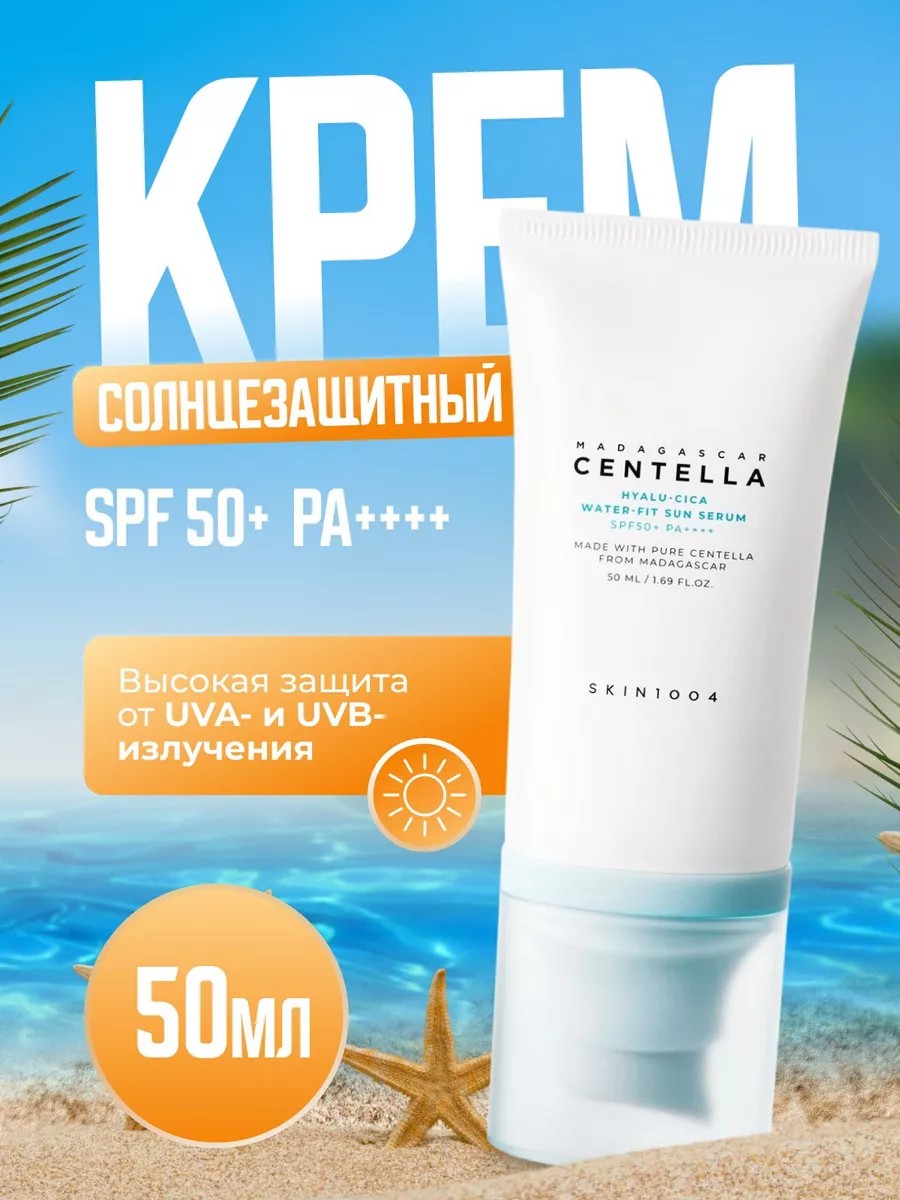 Солнцезащитная сыворотка SKIN1004 Madagascar Centella Hyalu-Cica Water-Fit Sun Serum SPF50+ PA++++ на основе безопасных химических фильтров нового поколения защищает кожу от вредного воздействия ультрафиолетовых лучей, одновременно оказывая на неё успокаивающее и увлажняющее действие.