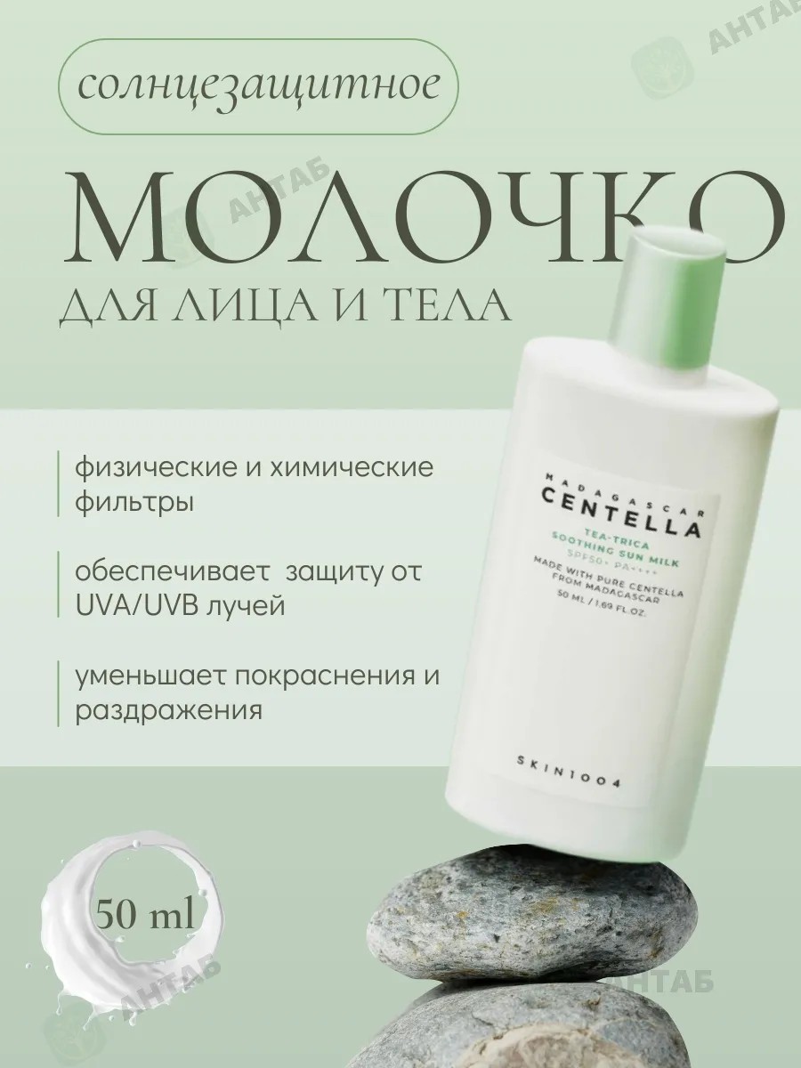 SKIN1004 Madagascar Centella Tea-Trica Soothing Sun Milk — лёгкое солнцезащитное молочко, которое объединяет эффективные физические и химические фильтры нового поколения, обеспечивающие высокую защиту от солнца и дополнительный уход за кожей.
