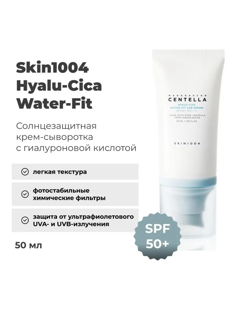 Солнцезащитная сыворотка skin 1004 spf Madagascar Centella Hyalu-Cica Water-Fit Sun Serum SPF 50+ PA++++ успокаивает, освежает и увлажняет кожу, создавая неощутимый барьер, который защищает от ультрафиолетового UVA- и UVB-излучения.