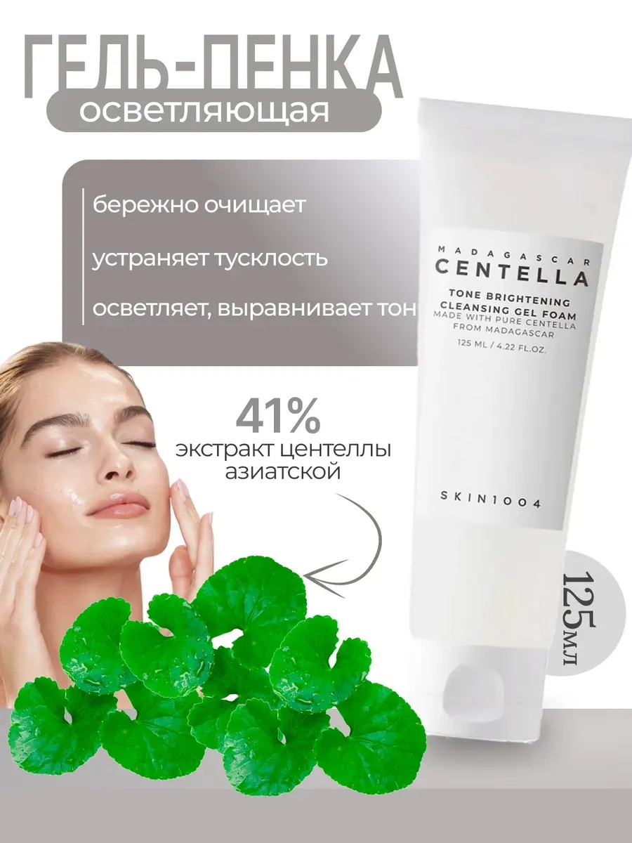 Гель-пенка SKIN1004 Madagascar Centella Tone Brightening Cleansing Gel Foam бережно удаляет загрязнения, осветляет и выравнивает тон, не вызывает чувства стянутости и сухости после умывания. Очищает от омертвевших частиц и мягко отшелушивает.