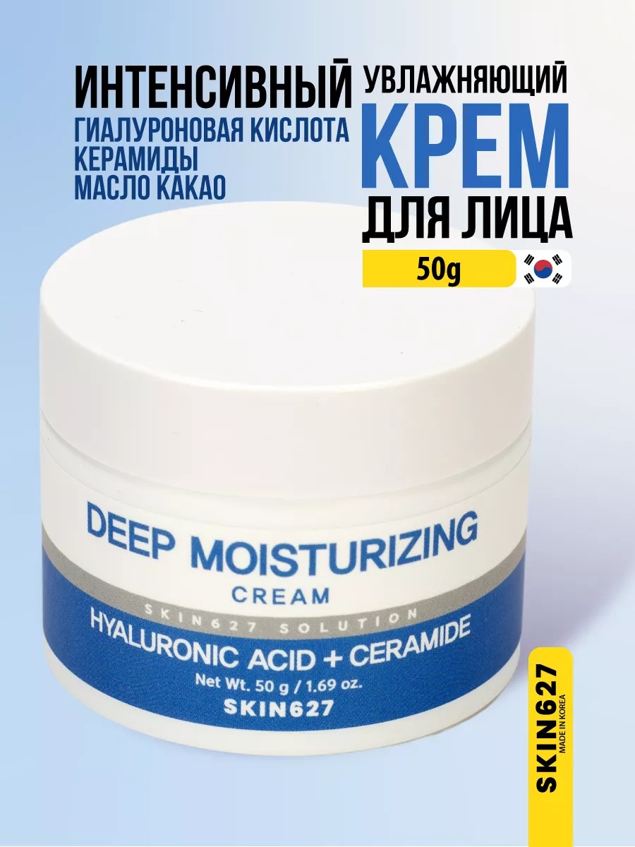 Крем ультра - увлажняющий, питательный для ухода за кожей лица, шеи и зоны декольте, Корея. 30 мл. SKIN627 Deep Moisturizing Cream, 50g. Питательный крем представляет совершенное сочетание активных компонентов для интенсивного увлажнения, защиты и поддержания здоровья кожи. Восстанавливает от повреждений и предотвращает появление признаков преждевременного старения, придавая жизненную силу уставшему эпидермису и избавляя от сухости и стянутости. Гиалуроновая кислота двух видов проникает в глубокие слои, разглаживает морщины, создает защитный слой, предотвращает потерю влаги и обеспечивает долгосрочное увлажнение. Керамиды NP эффективно укрепляют защитный слой, предотвращая обезвоживание и сохраняя естественный уровень влаги. Масло какао обогащает эпидермис питательными веществами и избавляет от ощущения сухости, придавая мягкость и гладкость. Подходит для всех типов кожи лица, в том числе и для сухой и обезвоженной, которой требуется вернуть здоровый и сияющий вид. Наслаждайтесь ощущением свежей, защищенной и упругой кожи благодаря этому сбалансированному крему. Применение: наносите на чистое лицо легкими массирующими движениями для интенсивного увлажнения, смягчения морщин и поддержания естественного баланса влаги. Повторяйте утром и / или вечером для ощущения свежести и усиления питательного воздействия. Корейский крем для лица станет идеальным подарком женщине - маме, подруге, девушке на день рождения, новый год, 8 марта. Рекомендуется в комплексе с серией корейской косметики для ухода за лицом и телом Skin627 / Скин 627.