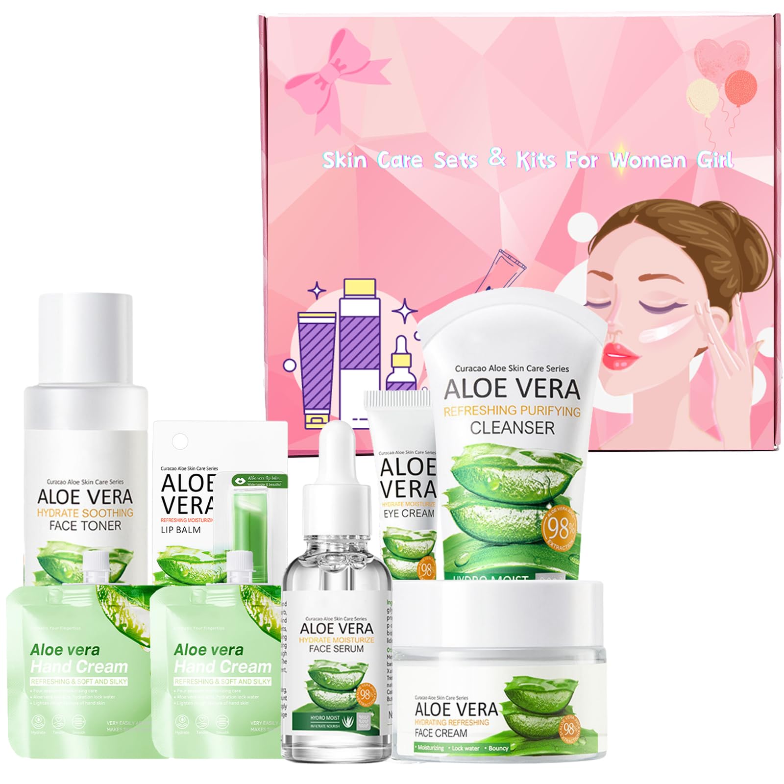 Product Features: Our skincare set is enriched with aloe vera, natural, safe and effective. The skin care set deeply cleans pores dirt, replenishes nutrition, keeps skin delicate and shiny, moisturizes and hydrates intensively. Package Included: 1 Aloe vera face cream 50g 1 Aloe vera face serum 30ml 1 Aloe vera lip balm 2.7g 1 Aloe vera eye cream 20g 1 Aloe vera cleanser 100g 1 Aloe vera face toner 120ml 2 Aloe vera hand cream 30g How to use: Step 1:take an appropriate amount of cleanser and add water to create a foam, massage gently on the face in circular motions for a while, then rinse off with water Step 2:take an appropriate amount of toner and pat evenly on the face, massage until absorbed Step 3:take an appropriate amount of eye cream and spread evenly on the eye area, massage until fully absorbed Step 4:take an appropriate amount of face serum and apply evenly to the face, massage until absorbed Step 5:take an appropriate amount of face cream and spread evenly on the face skin, massage until fully absorbed Step 6:open the cap of the lip balm, swirl out the lip balm, and apply evenly on the lips Step 7:take an appropriate amount of hand cream and spread evenly on the face skin, massage until fully absorbed Notice: 1.Before using this gift set, it is recommended that you try it on the skin behind your ears. If you feel uncomfortable, please stop using it. 2.Please keep the gift sets for women in a cool place and avoid high temperature and direct sunlight. 3.Please keep the gift set women out of the reach of children not for children under three years old. SAFETY WARNING Stay away from direct sunlight.Gifts for HerThe facial kit with aloe vera is a suitable choice to be an important gift for your teenage girls, women, family, lovers and friends in any occasions, works great as anniversary gift, Mother's Day gift, valentine's gift, birthday gift, thanksgiving gift and Christmas gift. Send them beauty, make them more confident!. 7-Steps for Daily Moisturizing Skin CareMoisturizing cleanser of our self care gifts for women helps to clean face and pores. Toner hydrates skin in time, making skin cool and shrinking pores. Face serum hydrates skin deeply and replenish nutrients. Aloe vera cream hydrates skin and locks in water, promoting face care. Eye cream can firm skin and smooth the fine lines. Lip balm improves lips color and moisturizes delicate lips. Hand cream can relieve hand dryness. Easily AbsorbedDesigned for skin care for teenage girls, our product has the perfect consistency, and the aloe vera essence is absorbed beautifully and quickly, without leaving greasy residue, rejuvenates skin, improves skin elasticity, restores even and translucent skin texture. You can apply our product and gently massage onto your face and eyes contour - specially formulated for all skin types. Mild and SafetyOur gifts for women contain natural organic aloe vera plant ingredients, which can penetrate deep into the bottom layer of the skin, continuously replenish moisture to the skin, to achieve long-lasting moisturizing skin care effects. The gift sets for women sale are no harmful chemicals added and will greatly improve condition of the skin. Skincare Gift SetThe 8-piece beauty gifts sets for women contain our facial cleanser, toner, lip balm, face serum, eye cream, face cream, hand cream. With the gentle effect of aloe vera, the beauty products can clean your face, sooth and moisturize your skin, helping to tackle the 5 early signs of dehydrated skin: dryness, dullness, dry dehydration lines, tightness, and roughness.