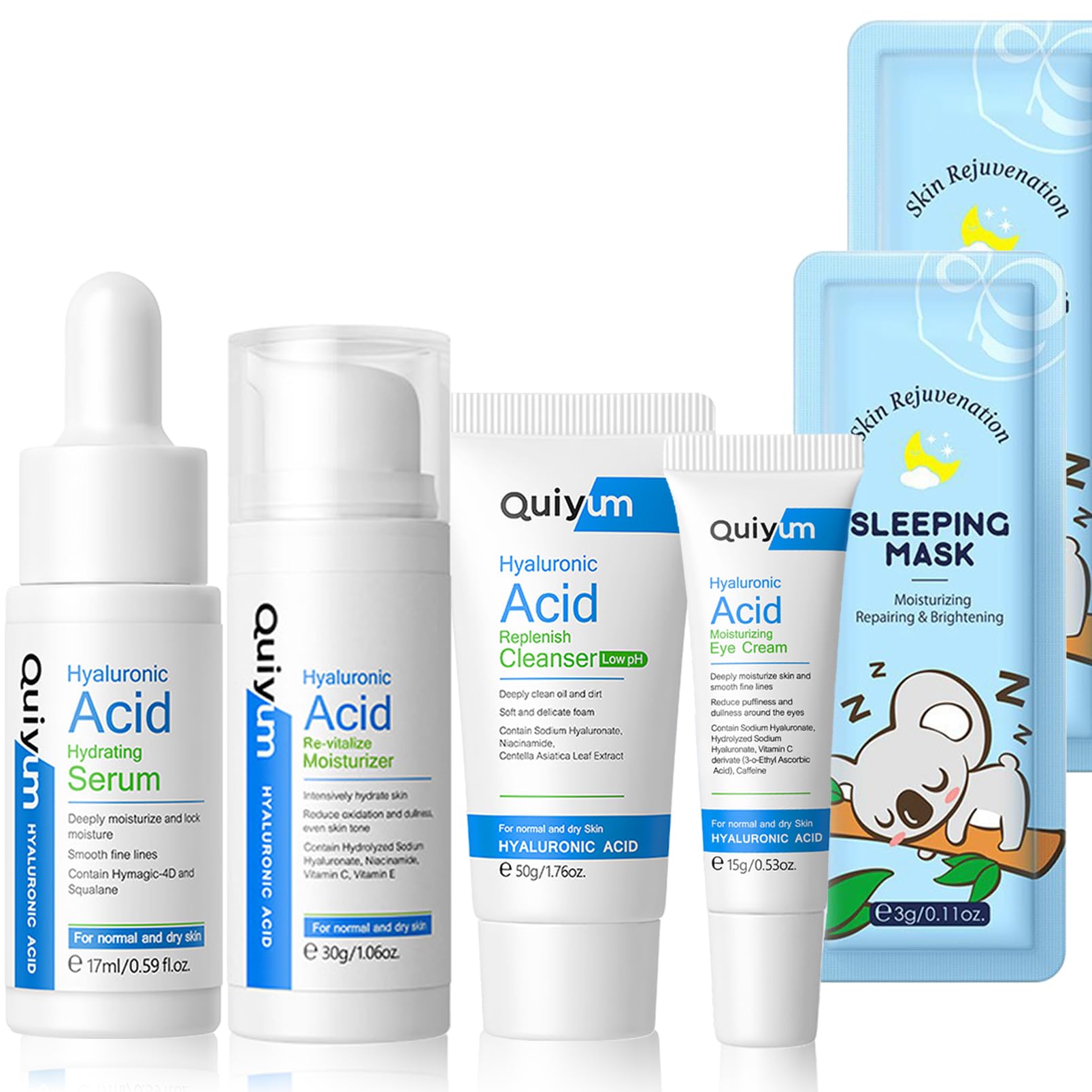 ?? HYALURONIC ACID SKIN CARE SETS & KITS 6PCS SKINCARE SETS FUNCION: HYDRATING & MOISTURIZING Face serums is full of hyaluronic acid that hydrate and moisturize the skin leaving it soft, smooth and glowing while improving dullness and age spots. No oily, sticky or greasy feeling. IMPROVE SKIN Hyaluronic acid face serum stimulate the production of new collagen,spot remover for face and wrinkles for fairer and pigmentation treatment with a radiant glow and make the skin look fuller and firmer. HYDROCHLORIC ACID FACE SERUM FOR WOMEN & MEN Face serum for women and men is suitable for any skin, dehydrated or dry skin, dull skin, oily skin and acne prone, aging wrinkle skin. PAMPER GIFTS FOR WOMEN Advent Calendar 2023 Skincare Gift Set helps smooth, hydrate, and plump your skin.Suitable for birthday, Thanksgiving, Christmas, Halloween or other holidays to buy for personal use or as a gift to your mother, wife, girlfriend! SUITABLE FOR TRAVELING You can easily put them in a bag, use them in the office, outdoors and in hotels, keep your skin clean and bright at all times, and protect your skin anytime and anywhere. PRODUCT INFORMATION: Hyaluronic Acid Face Serum 1pcs Hyaluronic Acid Face Moisturizer 1pcs Hyaluronic Acid Facial Cleanser 1pcs Hyaluronic Acid Eye Cream 1pcs Sleeping Mask 2pcs SAFETY WARNING no???????????????? ???????? ?????? ???????-Our advent calendar 2023 women are ideal gifts for girls, women, family, lovers and friends on Christmas, Thanksgiving, Valentine's Day, Mother's Day and other occasions. Send them beautiful women to make them more confident! This is a perfect choice. ???????????????????? ?????? ?????????????????????????-Our beauty products is rich in hyaluronic acid and calcium pantothenate, which can hydrate and moisturize the skin, make the skin soft, smooth and shiny, and improve dullness and age spots. Hyaluronic acid face serum for women and men. No oily, sticky or greasy feeling. ??????????-???????????????? ?????????????????????-Skincare serum with Hyaluronic Acid, glycerin and natural ingredients, our gift set women face serum helps to shrink pores and reduce the appearance of acne. Facial toner can soothe and calm the skin, reduce skin fatigue and tighten the skin. Feminine moisturizing cream deeply moisturizes skin, supplements nutrition and brightens skin. ???????????? ???????? ?????????????????????-Hyaluronic Acid Skincare Kit skin-friendly ingredients can moisturize your face, soothe and moisturize your skin, and the skin can quickly absorb the extract of hyaluronic acid serum, helping to solve the signs of dehydrated skin: dryness, dullness, dry dehydration line, tightness and roughness. ?????????????????????? ???????? ?????????? ???????????????? ???????-Our hyaluronic acid skin care kit with 6 pcs. Included a full skincare routine into this all-in-one set.Skincare set can make your skin younger, and make your skin full and energetic immediately by promoting the production of collagen.Collagen Serum For Face can bring immediate and long-term effects to young and moist skin.