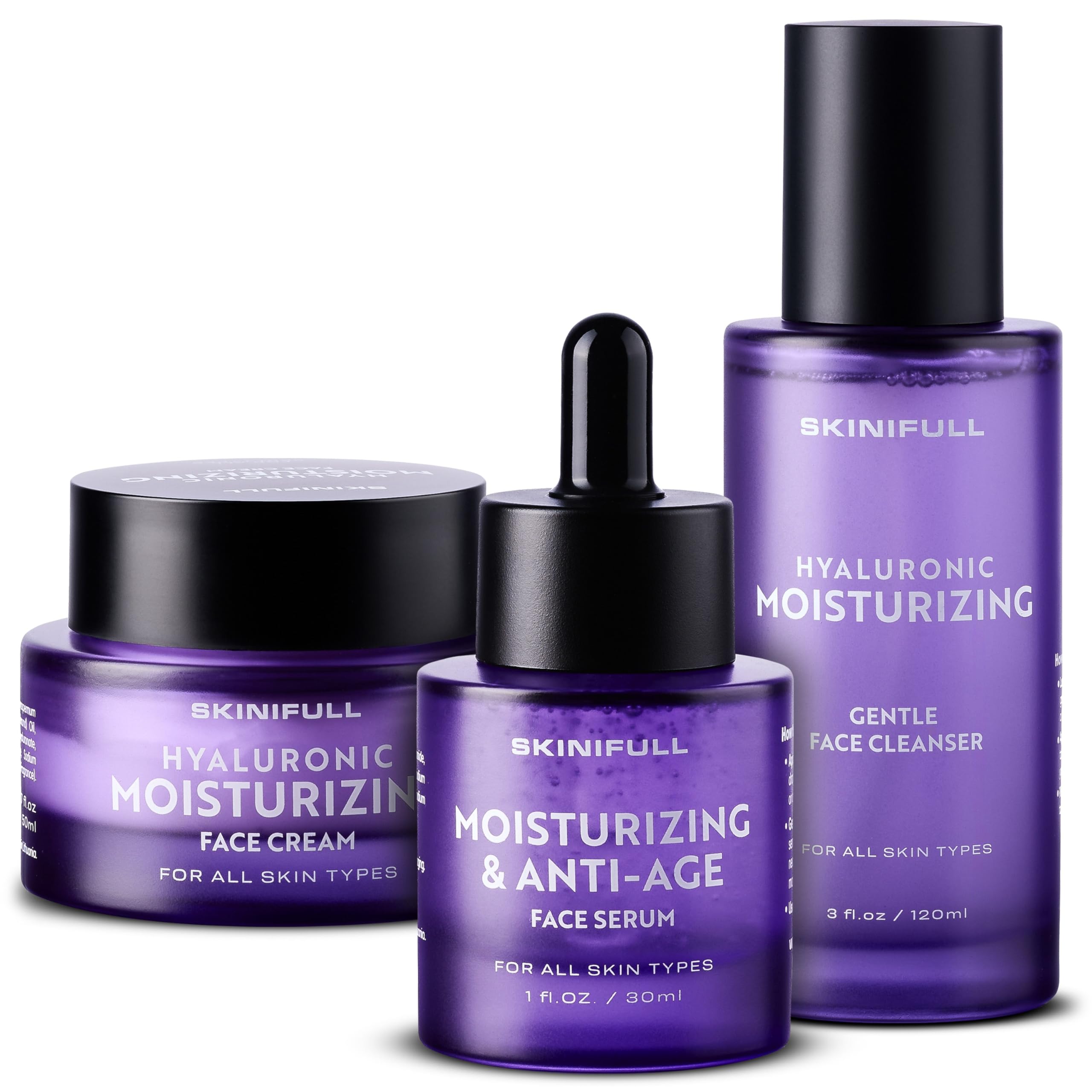 Skinifull Facial Skincare Set - Hyaluronic Face Cream, Anti-Aging Face Serum, and Face Cleanser Elevate your skincare routine with the Skinifull Facial Skincare Set, featuring the Hyaluronic Face Cream, Anti-Aging Face Serum, and Gentle Face Cleanser. This comprehensive set offers a complete regimen to cleanse, hydrate, and rejuvenate your skin. Each product is formulated with proven ingredients like hyaluronic acid, sweet almond oil, and vitamin E to deliver visible results. Suitable for all skin types and ages, this set provides an effortless and luxurious skincare experience. Key Features: Complete Skincare Routine: Includes Face Cleanser, Anti-Aging Serum, and Moisturizing Face Cream for a comprehensive regimen. Proven Ingredients: Formulated with hyaluronic acid, sweet almond oil, and vitamin E for effective results. Skin Benefits: Cleanses, hydrates, and rejuvenates the skin, improving elasticity and reducing signs of aging. Universal Suitability: Designed for all skin types and ages.PREMIUM QUALITY GREAT VALUE Heavy glass packaging, EU manufacturing standards and long-lasting formulas. A little goes a long way—excellent value for a complete facial skin care set or gift. GENTLE SKIN-FRIENDLY FORMULAS Widely praised for being gentle on sensitive and acne-prone skin. Cleans without stripping, hydrates without irritation and leaves skin soft, comfortable and balanced. EFFECTIVE 3-STEP FACIAL SKIN CARE KIT Gentle gel cleanser, fast-absorbing anti-aging serum and rich hyaluronic face cream work together for visible results without complicated routines. DEEP HYDRATION WITH HYALURONIC ACID Reviewers consistently report plumper, smoother-looking skin with improved elasticity. Helps reduce the appearance of fine lines caused by dehydration and dryness. ? ANTI-AGING SKIN CARE SET FOR WOMEN A complete 3-step facial skincare routine that visibly improves hydration, smoothness and skin texture. Designed for mature, dehydrated and sensitive skin types.