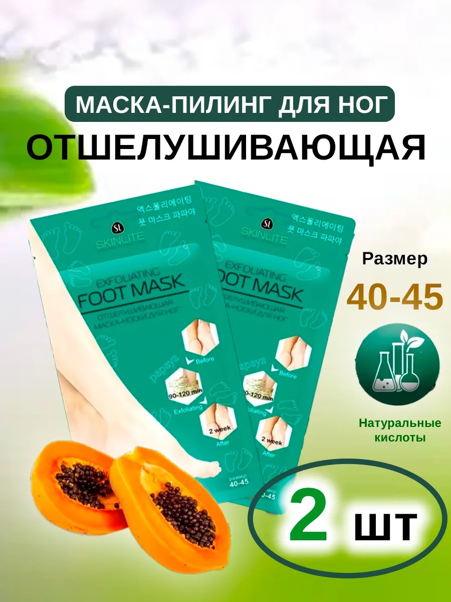 SL-725 Набор 2 шт. Отшелушивающая маска-носки Skinlite для ног — это эффективное средство для удаления мозолей, натоптышей и потрескавшейся кожи на стопах, предотвращающее огрубление кожи и образование новых трещин. Гликолевая, молочная и цитрусовая кислоты способствуют безболезненному и естественному удалению отмерших клеток. Натуральные экстракты папайи и яблока, морская вода оказывают смягчающее, увлажняющее и восстанавливающее действие. Экстракт ромашки успокаивает и помогает регенерировать кожу, а ментол защищает от потливости и подарит коже ног свежесть и чувство легкости! Форма маски в виде носков делает процедуру простой и приятной. Уже через 10–12 дней кожа ваших ног станет гладкой и нежной, как у младенца, а полученный результат будет радовать вас еще 2–3 месяца. Продлите эффект от применения отшелушивающих носочков, используя 1–2 раза в неделю Skinlite интенсивно-восстанавливающую маску-носки для ног.