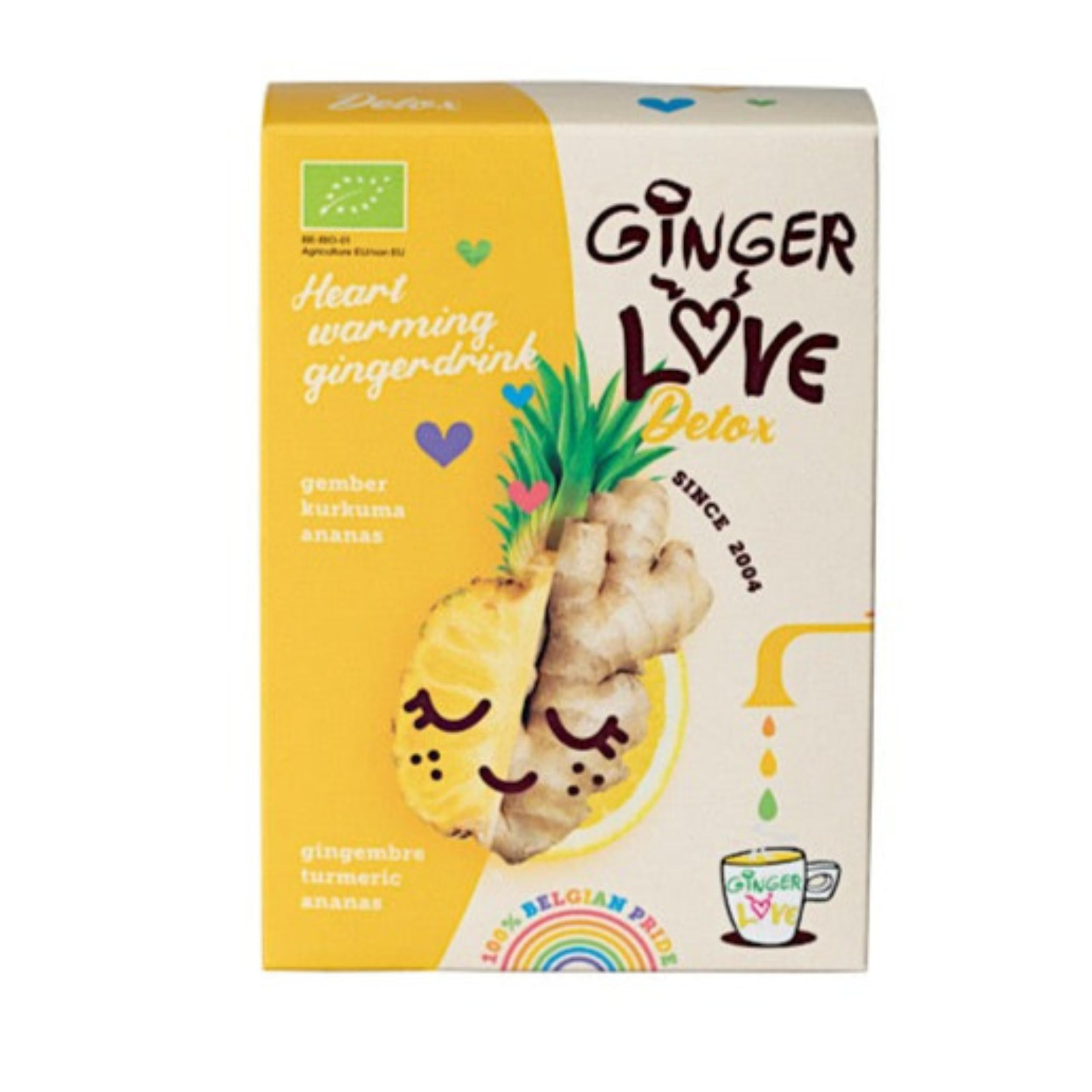 GingerLove Detox: Purify Your Body with Herbal Power Enter a world of purification with GingerLove Detox, a unique blend of ginger, turmeric and select herbs, specially formulated to help purify your body. The refreshing and warming properties of ginger combine seamlessly with the purifying power of natural herbs. Simply mix it with warm water and experience how GingerLove Detox helps you to refresh and renew your body, every sip brings you closer to a purer and more energetic self! Also discover our other unique blends: GingerLove Sleepy: The perfect drink for a restful night. GingerLove Original: The one and only original version GingerLove Beauty: Enriched with pomegranate for that radiant glow. GingerLove Energy: With Matcha for that much-needed energy boost. GingerLove Unsweetened: An unsweetened version of our beloved Original. Taste them all and find your favorite GingerLove blend!Gingerlove - Gingerlove Detox - Premium Gemberthee Met Ananas - Biologisch En Belgisch GingerLove Detox: Zuiver Je Lichaam met Kruidenkracht Betreed een wereld van zuivering met GingerLove Detox, een unieke blend van gember, kurkuma en geselecteerde kruiden, speciaal samengesteld om je lichaam te helpen zuiveren. De verfrissende en verwarmende eigenschappen van gember combineren naadloos met de zuiverende kracht van natuurlijke kruiden. Meng het eenvoudig met warm water en ervaar hoe GingerLove Detox je helpt om je lichaam te verfrissen en vernieuwen, elke slok brengt je dichter bij een zuiverder en energieker zelf! Ontdek ook onze andere unieke blends: GingerLove Sleepy: De perfecte drank voor een rustgevende nacht. GingerLove Original: De enige echte originele versie GingerLove Beauty: Verrijkt met granaatappel voor die stralende gloed. GingerLove Energie: Met Matcha voor die broodnodige energieboost. GingerLove Unsweetened: Een ongezoete versie van onze geliefde Original. Proef ze allemaal en vind jouw favoriete GingerLove blend!