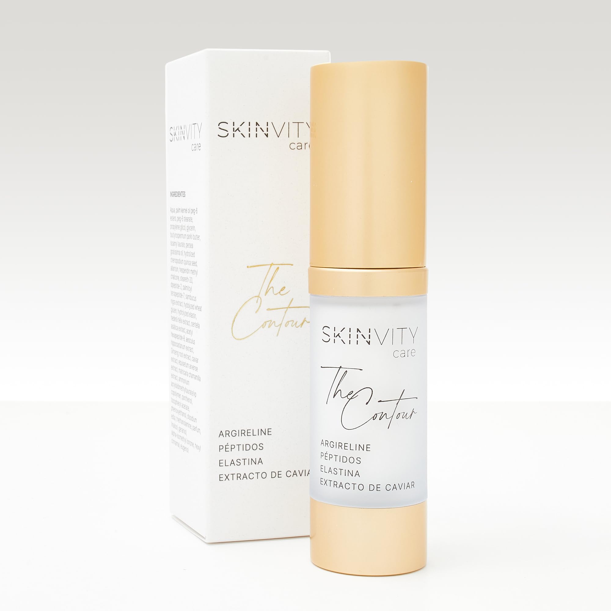 Discover The Contour by SKINVITY Care, an innovative eye contour treatment that will revolutionize your skincare routine. This luxurious treatment combines exceptional ingredients such as Argireline, an advanced peptide that provides an immediate tightening effect and helps reduce expression lines. Its exclusive formula includes black elderberry extract, which effectively targets dark circles, while shea butter provides deep nourishment. Caviar extract, a premium ingredient, improves microcirculation, helping to reduce the appearance of puffiness and dark circles. The silky, enveloping texture melts seamlessly into the delicate skin around the eyes, delivering instant and long-lasting hydration. Its delicate fragrance and elegant presentation in a gold pump bottle make each application a unique sensory experience. Ideal for those seeking an effective and sophisticated eye contour treatment. SAFETY WARNING Do not ingest. Keep out of reach of children.