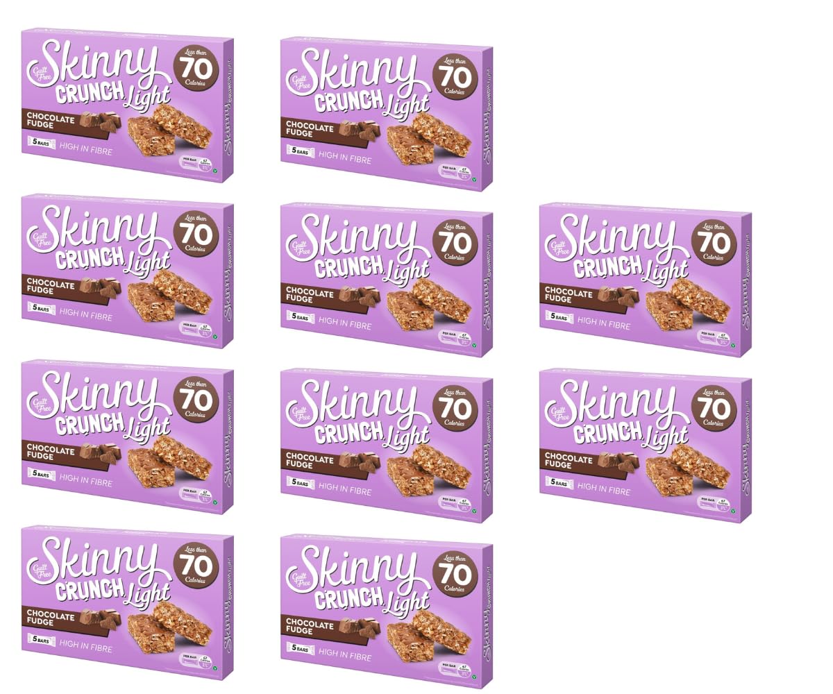 Skiny Crunch Light Bars 5pk. A low calorie chocolate snack. Perfect for a quick snack on-the-go. High in fibre and fewer than 70 calories per bar. Flavour: Chocolate Fudge 5 pack. INGREDIENTS Crunch Light Chocolate Fudge Bars