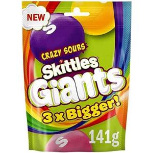 Oversized and scrumptiously sour sweets, three times the size of original Skittles but with the same crisp shells, chewy centres, and a rainbow of tangy fruit flavours. This Skittles treat size bag is a chance to share all of that sweetness with friends, family, or coworkers. Take Skittles Giants sweets to go, or stock your home or office sweets bowl with a sweet treat that everyone will love. Make every celebration sweeter: ideal for birthday parties, big nights in with friends, or Halloween sweets. These giant Skittles contain Sour Pineapple, Sour Raspberry, Sour Apple, Sour Mandarin, and Sour Cherry. Did we mention they're sour. No two rainbows are the same and neither are two packs of Skittles, so enjoy a deliciously odd mix every time. INGREDIENTS SUGAR, GLUCOSE SYRUP, PALM FAT, ACID (MALIC ACID), DEXTRIN, MODIFIED STARCH, MALTODEXTRIN, ACID (CITRIC ACID), FLAVOURINGS, COLOURS (E163, E162, E170, E100, E153, E160A, E133), SWEET POTATO CONCENTRATE, ACIDITY REGULATOR (TRISODIUM CITRATE), GLAZING AGENT (CARNAUBA WAX), RADISH CONCENTRATE MANUFACTURER CONTACT INFORMATION Get in touch: 0800 952 0077, www.mars.co.uk contact, Freepost Mars Wrigley Confectionery UK Ltd. See more
