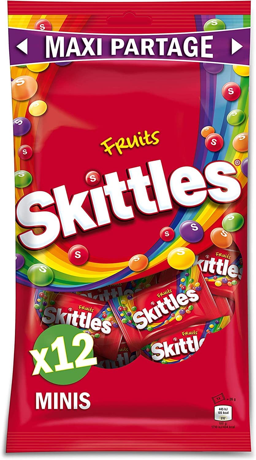 Skittles pouch containing 312g of sweets with a delicious Fruit flavor to share with your friends and your friends' friends. Skittles, soft sweets with fruits in the colors of the rainbow! A variety of flavors: strawberry, lemon, apple, grape or raspberry. INGREDIENTS INGREDIENTS: SUGAR, GLUCOSE SYRUP, PALM FAT, ACIDIFIERS CITRIC ACID, MALIC ACID DEXTRIN, MALTODEXTRIN, FLAVORS, MODIFIED STARCH, COLORS E162, E163, E170, E160a, E100, E132, E133 ACIDITY CORRECTOR TRISODIUM CITRATE, COATING AGENT CARNAUBA WAX DIRECTIONS FOR USE A varied, balanced diet and a healthy lifestyle are important. SAFETY WARNING No warnings Contents: 12 x 26g, 312g. Delicious, its formula is now deliciously vegan, so everyone can enjoy our Skittles. Add a pop of rainbow color to any gathering. Skittles are the perfect party treat, whether it's a family barbecue or your best friend's birthday. These little rainbow candies can brighten up kitchen cupboards and desk drawers alike and add to your candy stash. Soft candies with a crispy shell in a rainbow of fruity flavors, blackcurrant, lemon, lime, orange, and strawberry. Pochon Skittles contenant 312g de bonbons dragéifiés au bon goût de Fruits à partager avec tes amis et les amis de tes amis. Skittles, des bonbons tendres dragéifiés aux fruits aux couleurs de l'arc-en ciel! Une variété de parfums : fraise, citron, pomme, raisin ou framboise. INGRÉDIENTS INGREDIENTS: SUCRE, SIROP DE GLUCOSE, GRAISSE DE PALME, ACIDIFIANTS ACIDE CITRIQUE, ACIDE MALIQUE DEXTRINE, MALTODEXTRINE, AROMES, AMIDON MODIFIE, COLORANTS E162, E163, E170, E160a, E100, E132, E133 CORRECTEUR D'ACIDITE CITRATE TRISODIQUE, AGENT D'ENROBAGE CIRE DE CARNAUBA MODE D'EMPLOI Une alimentation variée, équilibrée et un mode de vie sain sont importants. AVERTISSEMENT DE SÛRETÉ Auccun avertissement Contenu : 12 x 26g, 312g. Savoureux, sa formule est maintenant délicieusement végane, pour que tout le monde puisse profiter de nos Skittles. Ajoutez une touche de couleur arc-en-ciel à n'importe quel rassemblement. Les Skittles sont les friandises idéales pour les fêtes, qu'il s'agisse d'un barbecue en famille ou de l'anniversaire de votre meilleur ami. Ces petits bonbons arc-en-ciel peuvent aussi bien égayer les placards de la cuisine que les tiroirs du bureau et s'ajouter à votre réserve de bonbons. Des bonbons moelleux à la coque croustillante dans un arc-en-ciel de saveurs fruitées, goût cassis, citron, citron vert, orange et fraise.