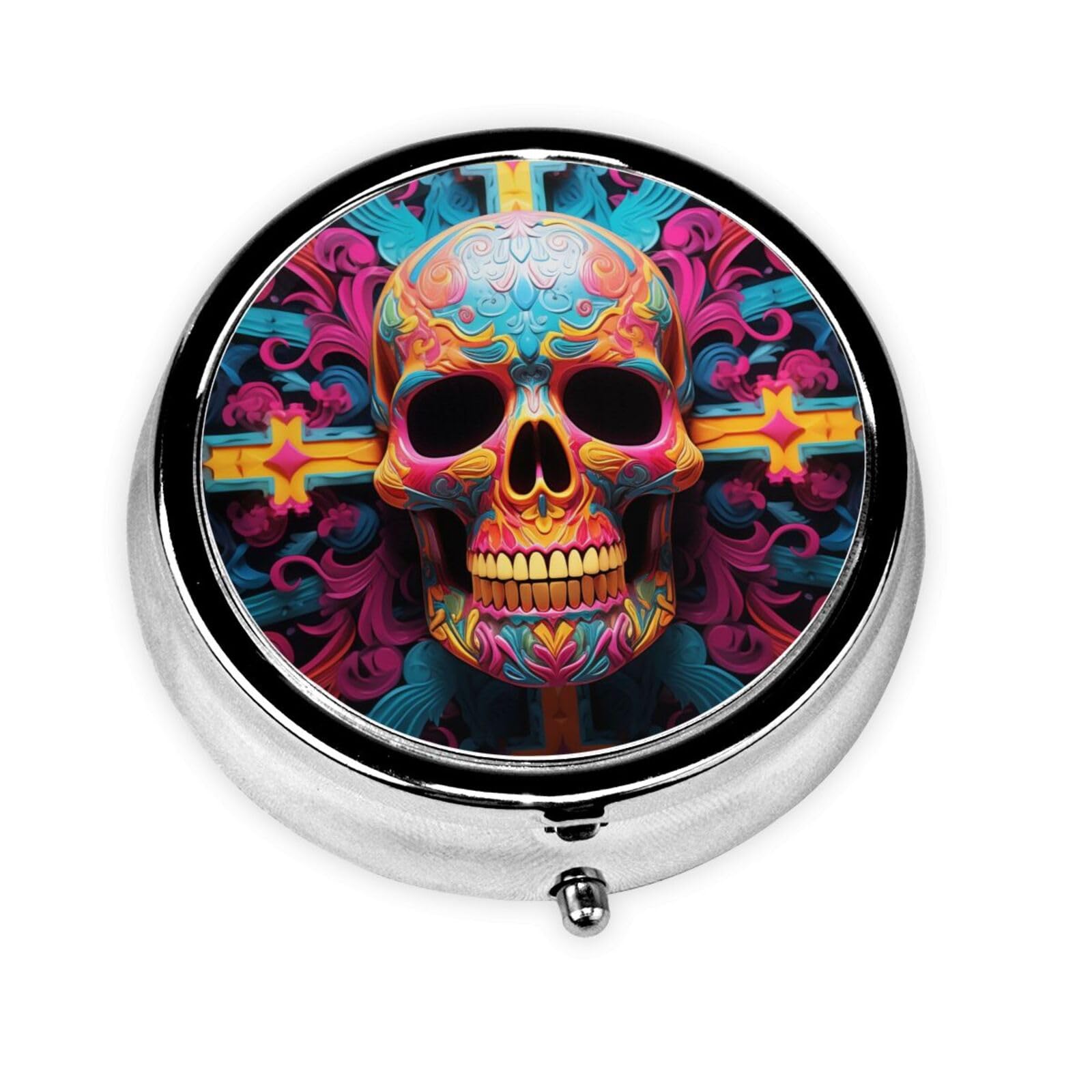 Wide range of applicable scenarios: suitable for use in various occasions such as home, office, and travel, providing you with convenient drug storage solutions. Multi-grid plastic inserts: The medicine box is designed with 3 plastic inserts inside, which can separate and store different types of pills, making them more organized and convenient to use. Convenient opening button design: The medicine box button design is easy to open, convenient and fast, and simple to operate, allowing you to easily access the medicine. Environmentally friendly metal material: Made of environmentally friendly metal iron plating material, it is durable, safe and reliable, and protects medicines from damage. Skull pattern cross Portable mini design: round mini pill box, measuring 2.0x2.0x0.7 inches, lightweight and portable, suitable for carrying in pockets and purses, providing you with urgently needed medicines anytime and anywhere.