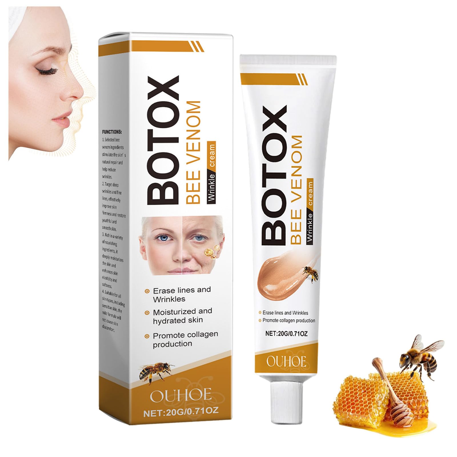 Bee Venom Anti-Wrinkle Cream: Firms, tightens, and moisturizes skin for a youthful, radiant appearance – for all skin types Directions for safe use: After cleansing and toning, apply an appropriate amount of Bee Venom Anti-Wrinkle Cream evenly to the face and gently massage in circular motions until fully absorbed. Specifications: Name: Bee Venom Anti-Wrinkle Face Cream Net weight: 20g Shelf life: 3 years Package contents: 1 2 3 6 Bee Venom Anti-Wrinkle Face Creams Note: 1. Please allow 1-5g 1-2cm error due to manual measurement. 2. The color of the item may vary from the photo, depending on your computer's display and brightness settings. Thank you for your understanding. SAFETY WARNING Store in a cool, dry place away from sunlight. Keep out of reach of children.
