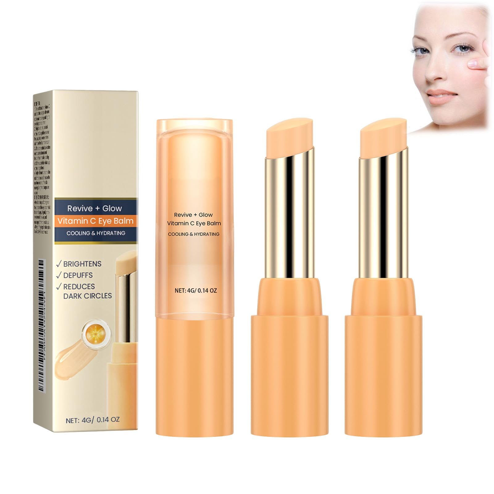 Revive Glowing Vitamin C Eye Balm - Brightens, reduces dark circles and puffiness, hydrates, and smooths for a radiant complexion under the eyes. Specifications: Name: Vitamin C Eye Balm Stick Net Contents: 4g Shelf Life: 3 years Package Contents: 1 2 3 6 Vitamin C Eye Balm Sticks Note: 1. Please allow 1-5g 1-2cm error due to manual measurement. 2. The actual color of the item may vary slightly from the image due to differences in monitor settings and lighting. Thank you for your understanding. SAFETY WARNING Store in a cool, dry place away from direct sunlight. Keep out of reach of children.