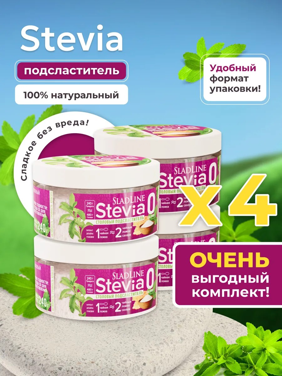 Сахарозаменитель Stevia SladLine в удобной упаковке по 240 г, в комплекте 4 банки.
