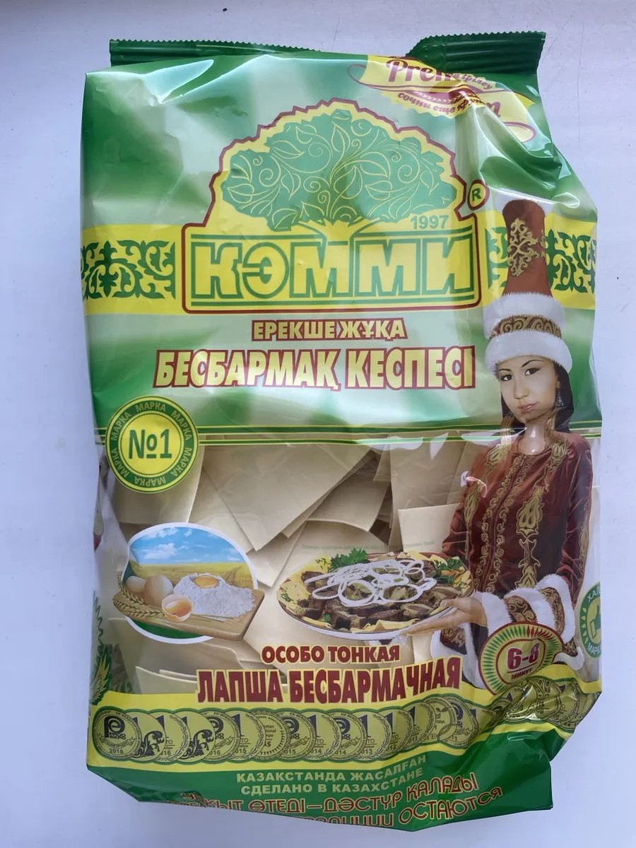 Egg noodles/beshbarmak dough/Zhaima pasta, 6 pcs. 250g each. Made from premium Kazakh wheat varieties. Egg noodles for beshbarmak are a traditional Kazakh meat dish. This tender and juicy filling is usually served with thin flatbreads (dough) and topped with broth. Directions: Add the noodles to boiling broth and simmer over low heat, stirring occasionally, for 5-7 minutes. Enjoy!