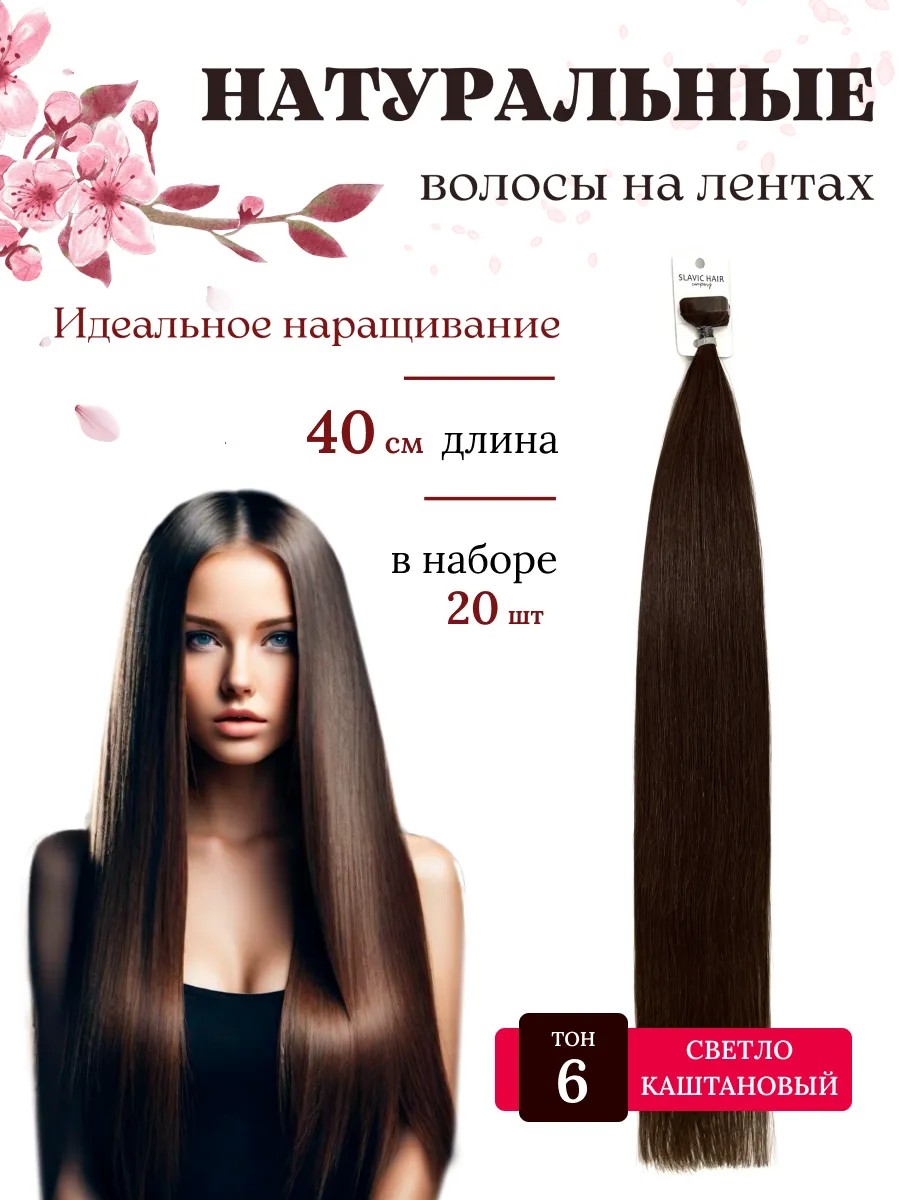 100% Натуральные Прямые волосы для наращивания на лентах оттенок светло - каштановый. Тон палитры 6 . Славянские пряди категории Сингл Дрон гладкие с плотными концами. Без силикона и обработки. Премиум качества - мягкие и не путаются. В наборе 20 лент в упаковке. Для полного наращивания и увеличения длины необходимо 3-5 упаковок, в зависимости от длины и густоты шевелюры. Для загущения 1-2 набора. Чем длиннее пряди вы берете, тем больше грамм понадобиться. Холодное ленточное наращивание - самый безопасный способ. Свои волосы не поддаются термической обработке, а приклеиваются на гипоаллергенные полимерные ленты, растворимые специальными ремуверами. Процедура имеет большие плюсы: Быстрота –всего 30 минут. Безопасность - отсутствие высокие температуры и вредные вещества. Быстро делается и легко снимается. Преимущество очевидно - простота наращивания и снятия.