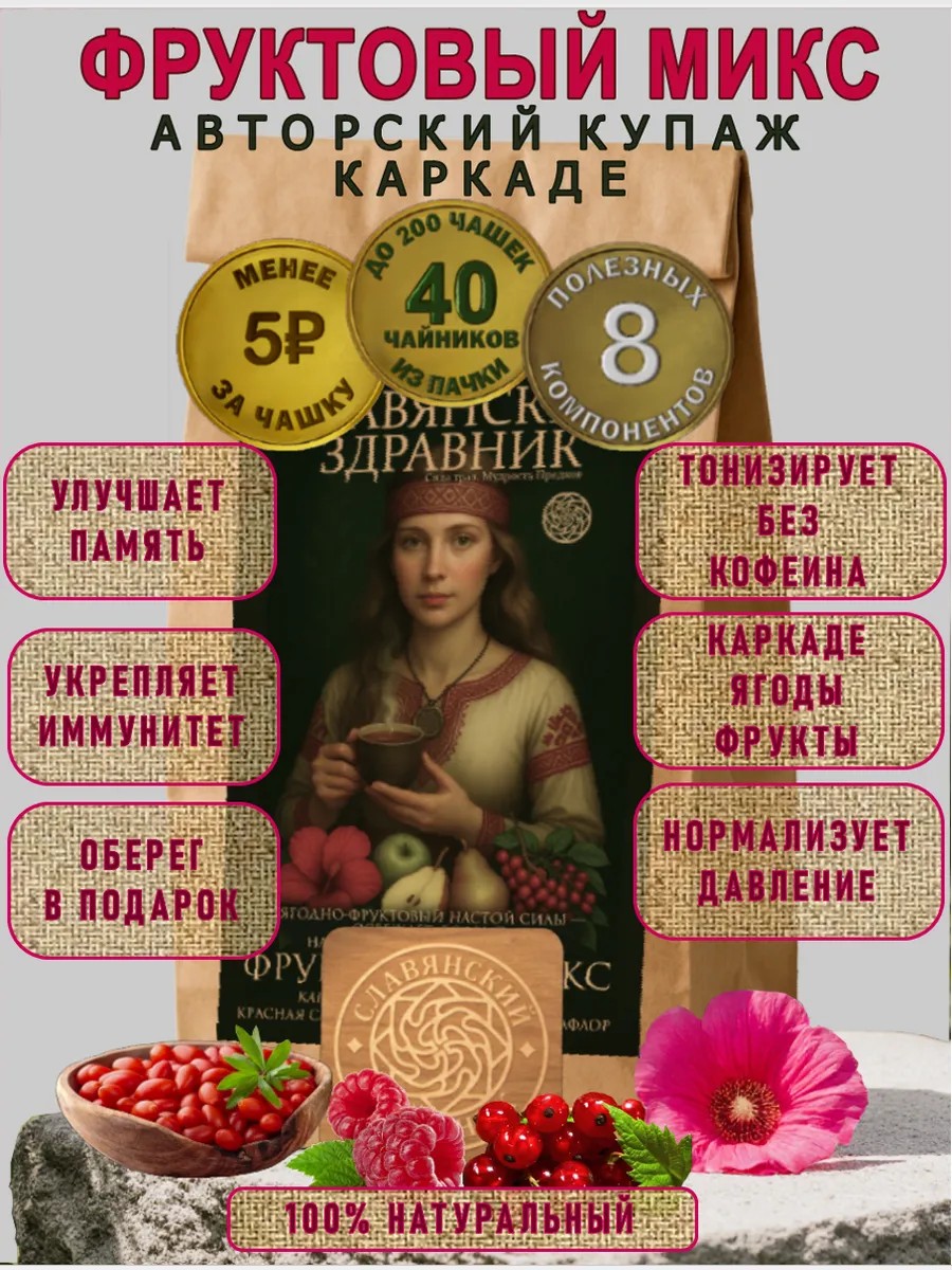 Подарите себе и вашим близким настоящий авторский фиточай "Славянский здравник"! Наш фруктовый чай — это не просто напиток, а удивительный заварной сбор, в который входят яркие вкусы Гибискуса (каркаде), освежающие кусочки яблок и груши, а также сочные ягоды малины, красной смородины и экзотические ягоды годжи.