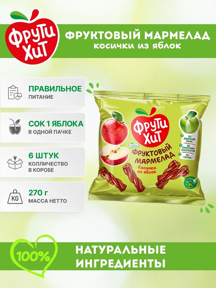 Лакомство состоит всего из 4 натуральных ингредиентов: яблочного сока, яблочного пюре и пектина. Отсутствие консервантов и красителей делает наши сладости идеальным выбором для тех, кто следит за своим здоровьем и питанием. Диетические ПП продукты рекомендованы диетологами тем, кто ведет ЗОЖ, заботится о своей фигуре, при диете и похудении, при диабете подходит диабетикам, веганам и спортсменам. В каждой коробке Вы найдете 6 пакетиков ароматных косичек мармеладок, которые станут отличным дополнением к чашечке чая или кофе. Фруктовые кондитерские изделия для тех сладкоежек, кто обожает подобные подарки. Преподнесите на чаепитие воспитателю, на день учителя и 1 сентября, как корпоративный презент коллеге на Новый год. Или как перекус в офисе маме и папе. Можно ребенку в детский сад и школу. Порадуйте любимого человека, жену и подругу. Восторг гарантирован.